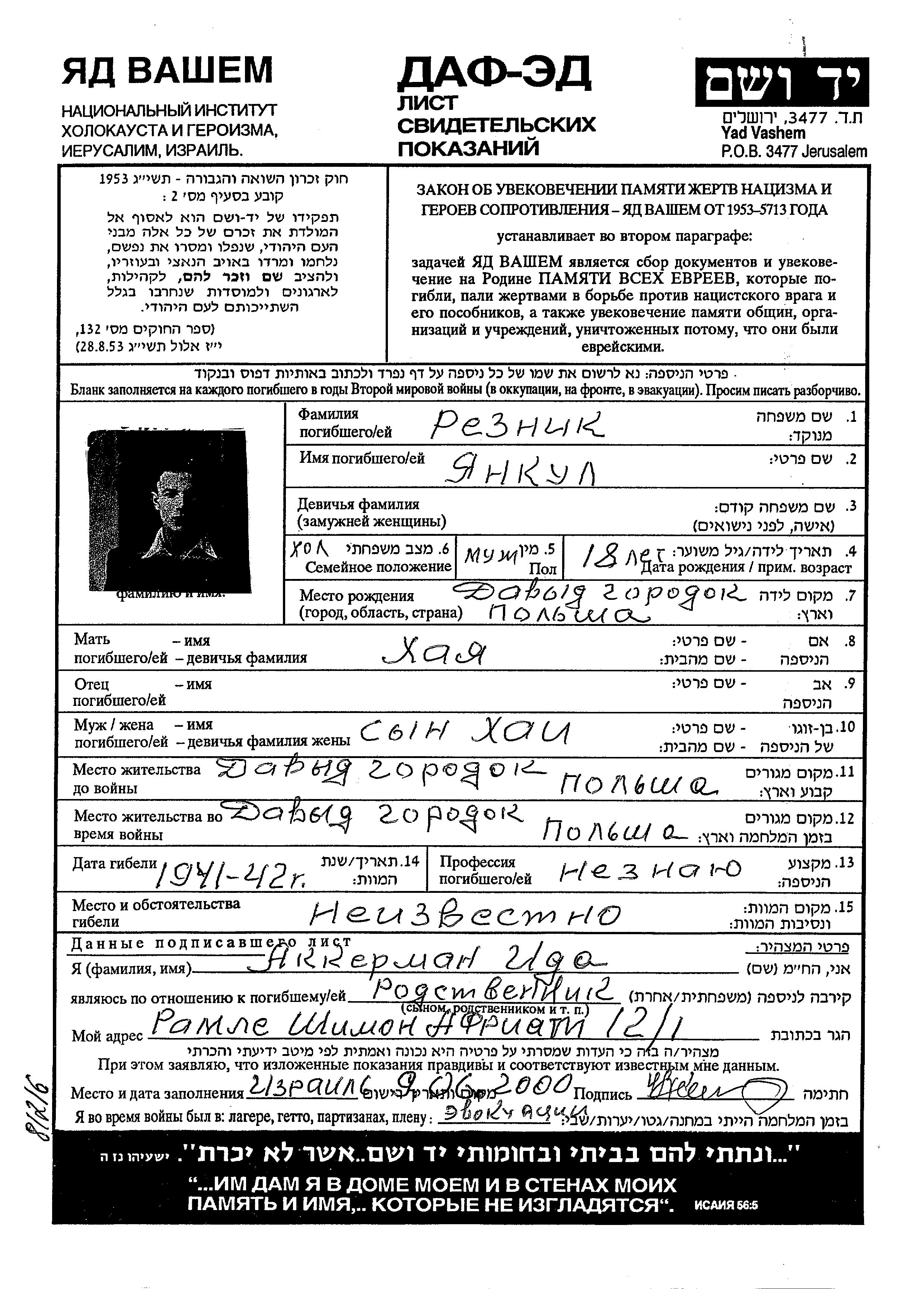 Резник | Янкул | Давид-Городок, Польша | Лист свидетельских показаний | |