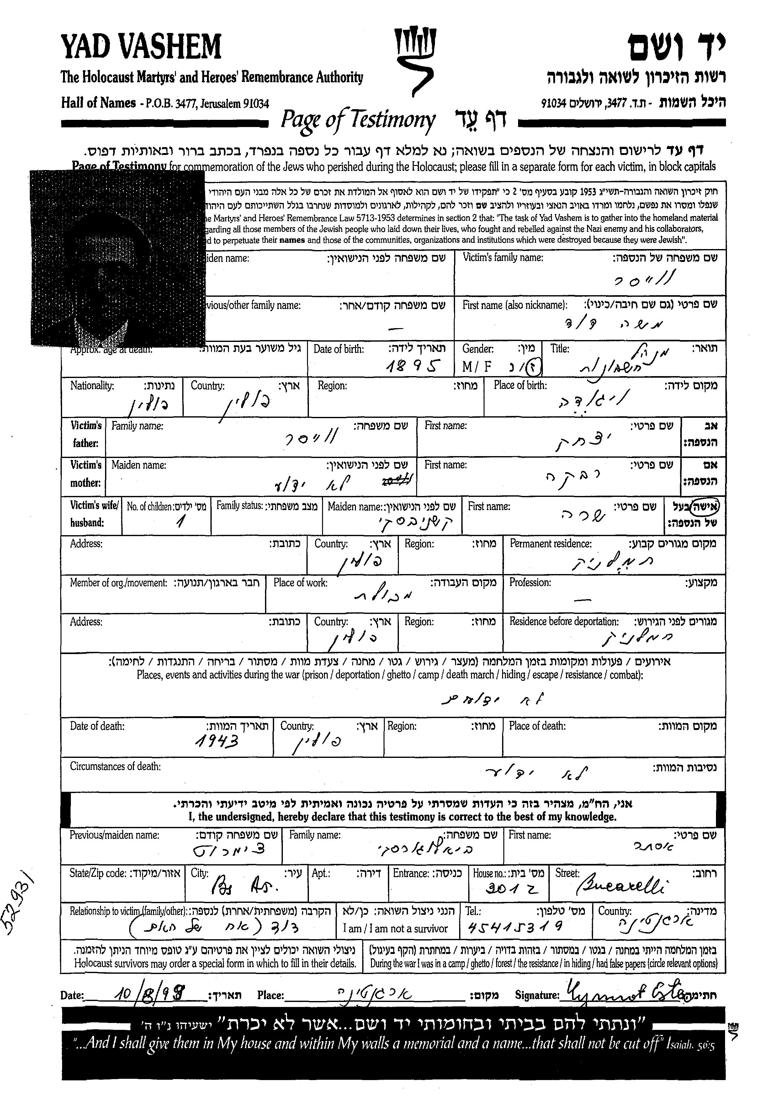 | Вейсер | Моше Давид | 1895 | Хмельник, Польша | Лист свидетельских показаний |
