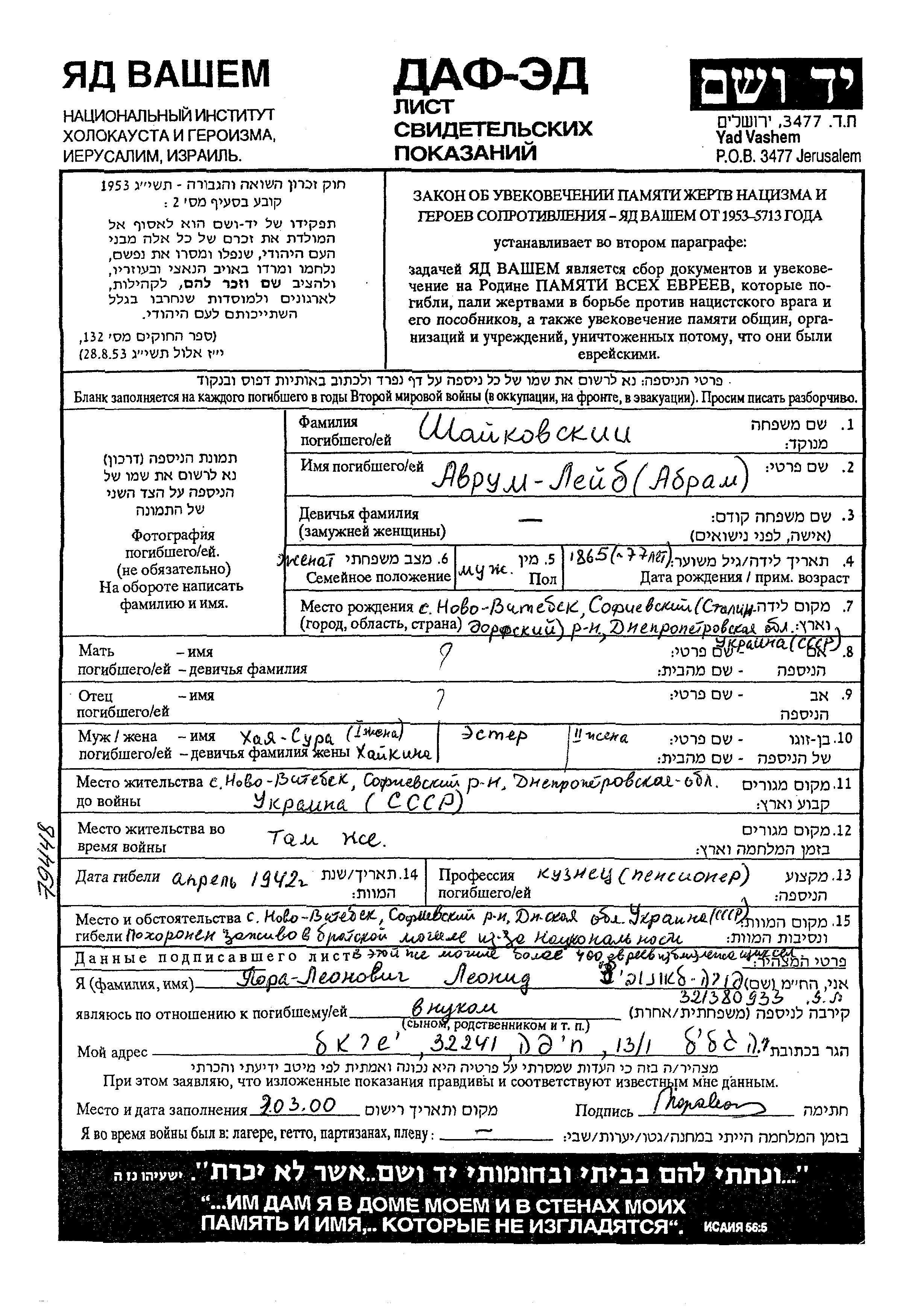 Шайковский Аврум Лейб 1865 Ново-Витебск, Украина (СССР) Лист свидетельских показаний