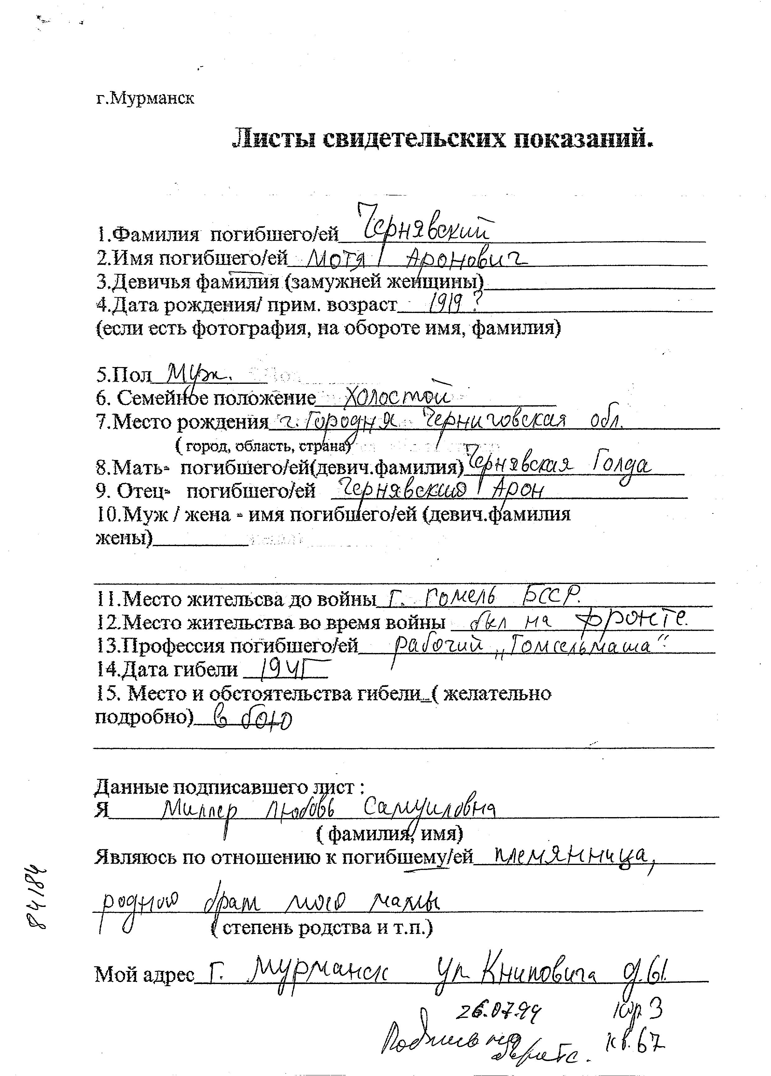 Чернявский Мотя 1919 Гомель, Белоруссия (СССР) Лист свидетельских показаний