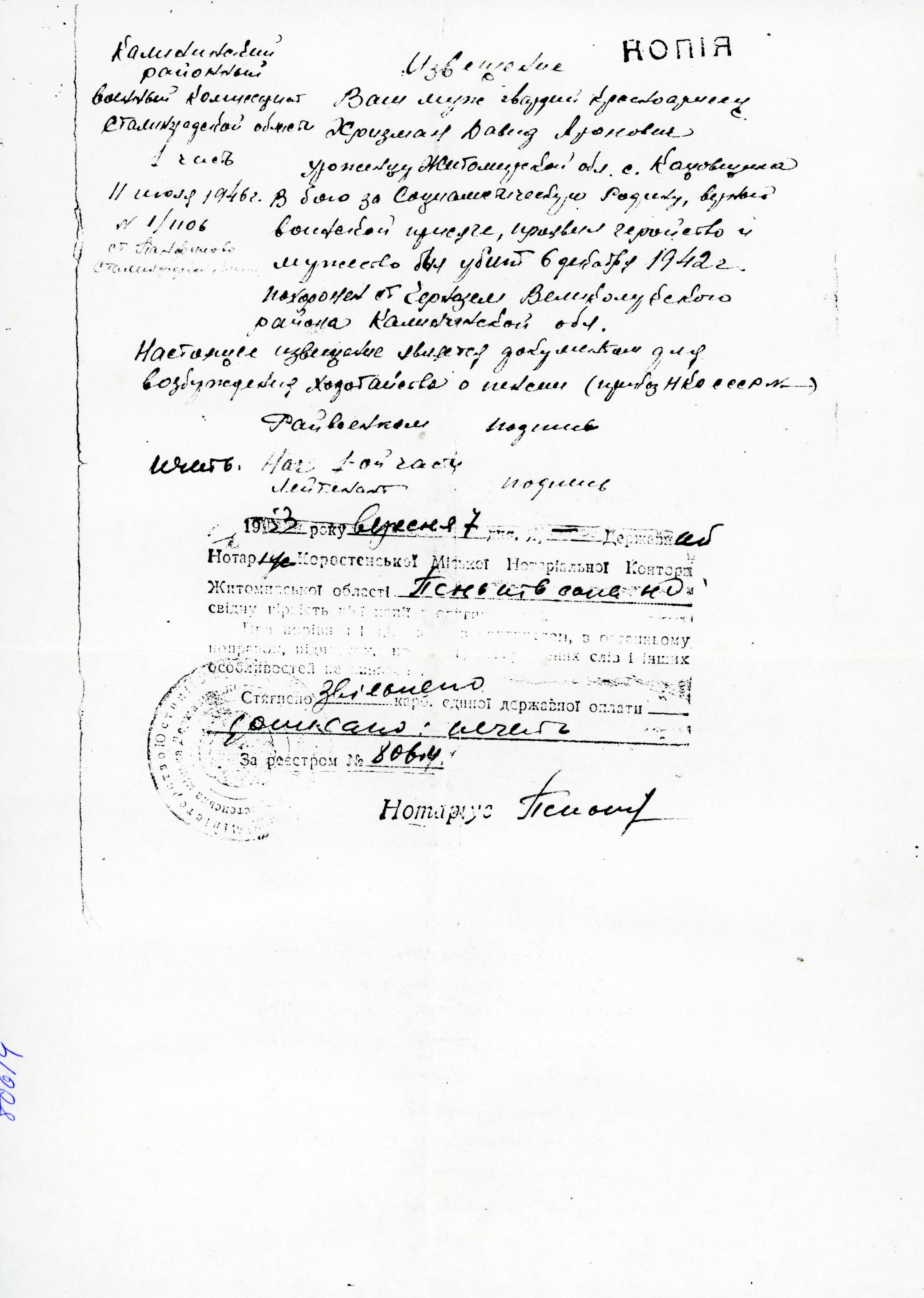 Давид Хризман, место рождения: Кацовщина, Украина (СССР). Рабочий / рабочая. Место жительства до войны: Коростень, Украина (СССР). Давид погиб на военной службе. место смерти: Чернозём, Россия (СССР) в 06/12/1942.
