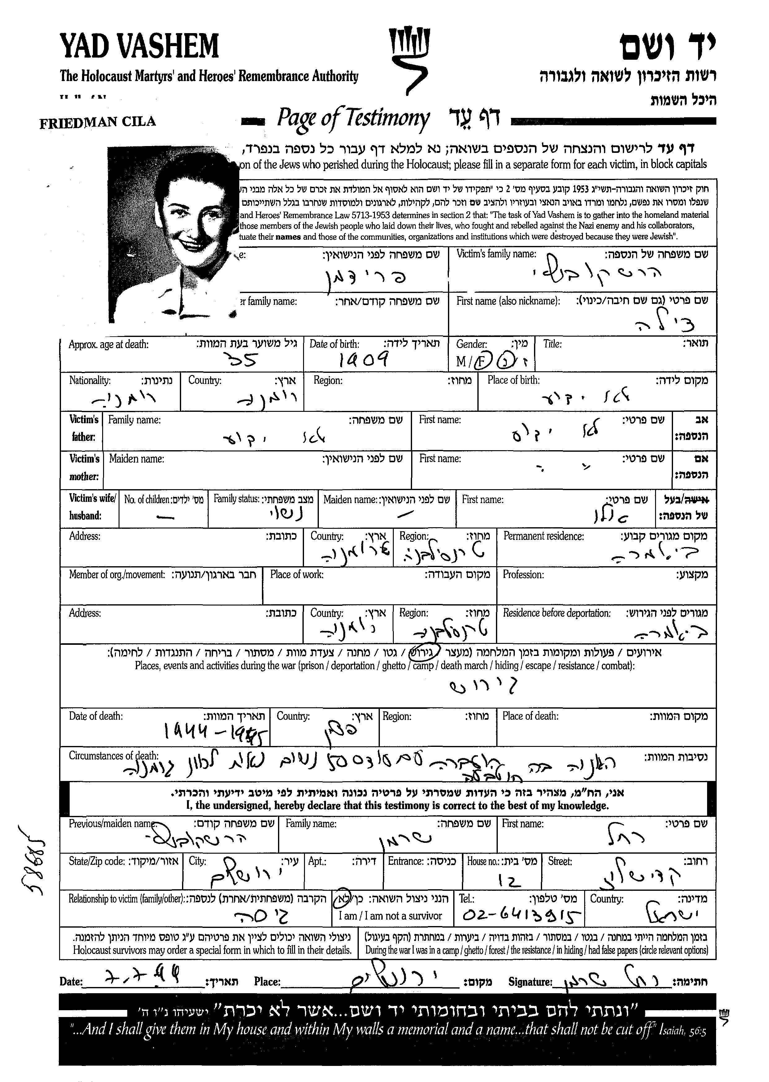 Яд Вашем - Листы свидетельских показаний Мемориального фонда
