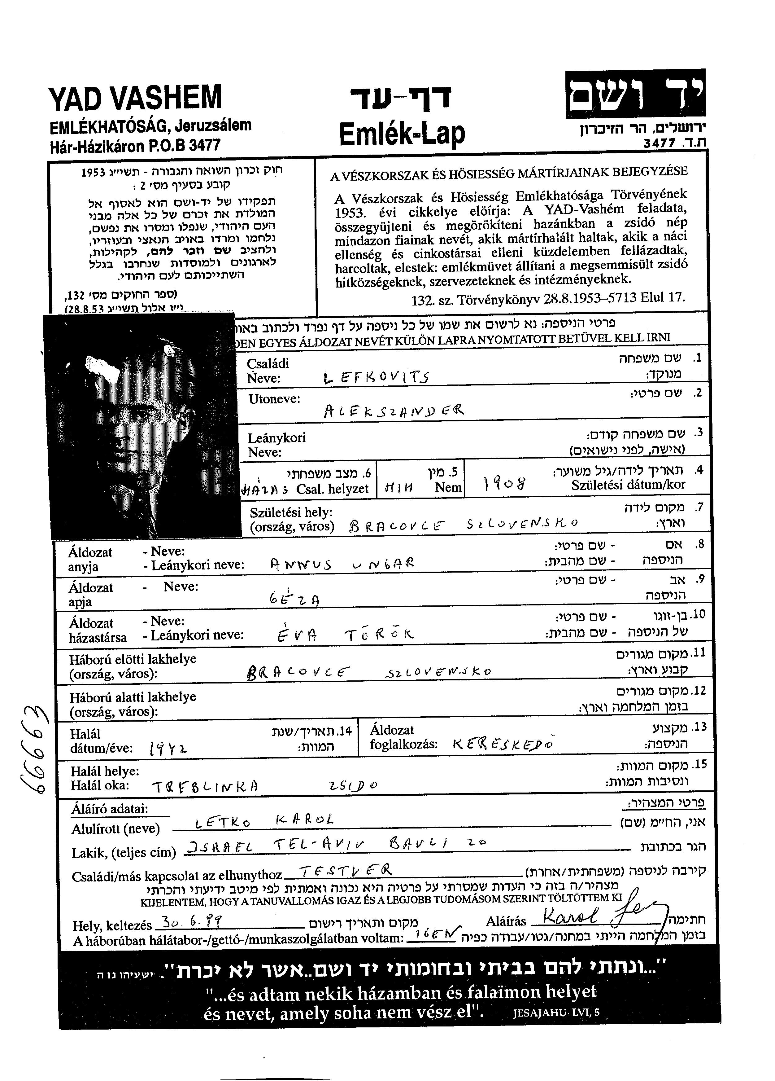 Лефковиц | Александер | 1908 | Брацовце, Чехословакия | Лист свидетельских показаний |