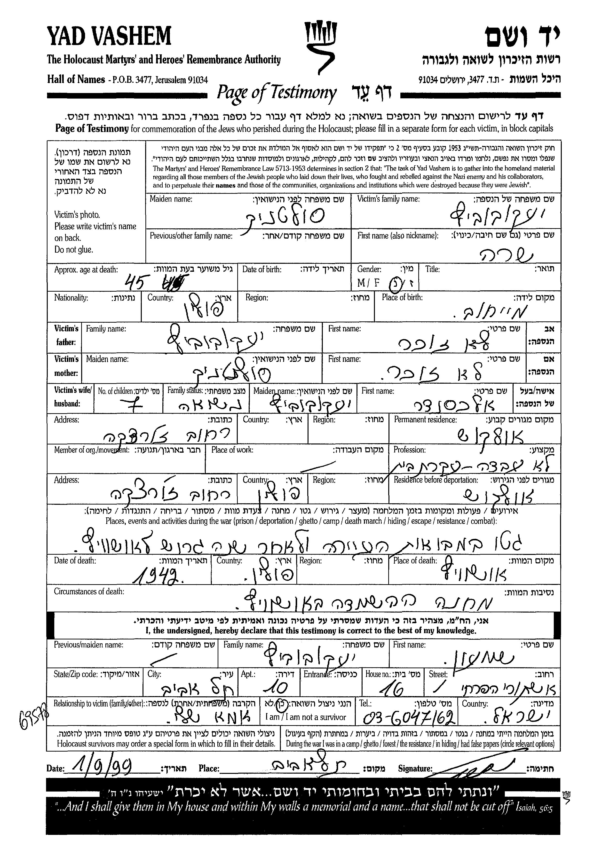 Яд Вашем - Листы свидетельских показаний Мемориального фонда