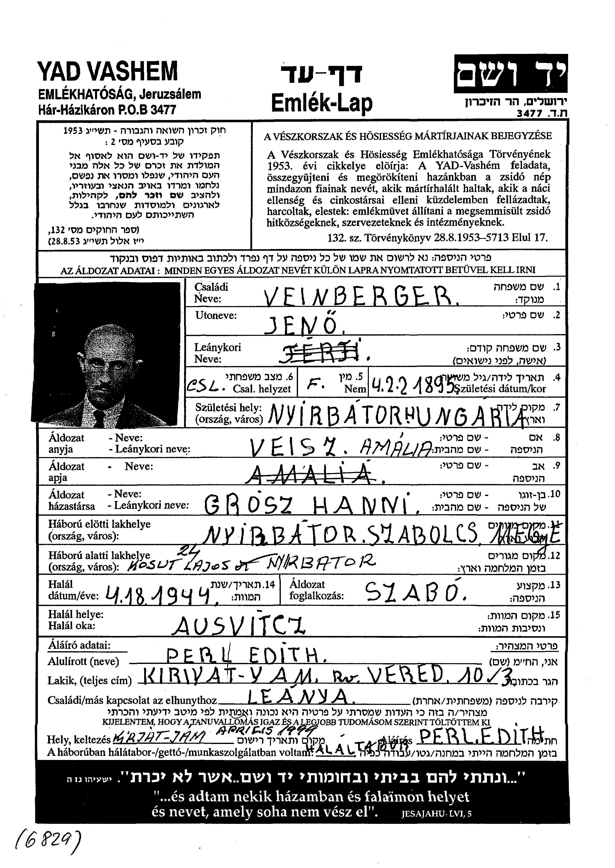 Вайнбергер Ено 1895 Ньирбатор, Венгрия Лист свидетельских показаний