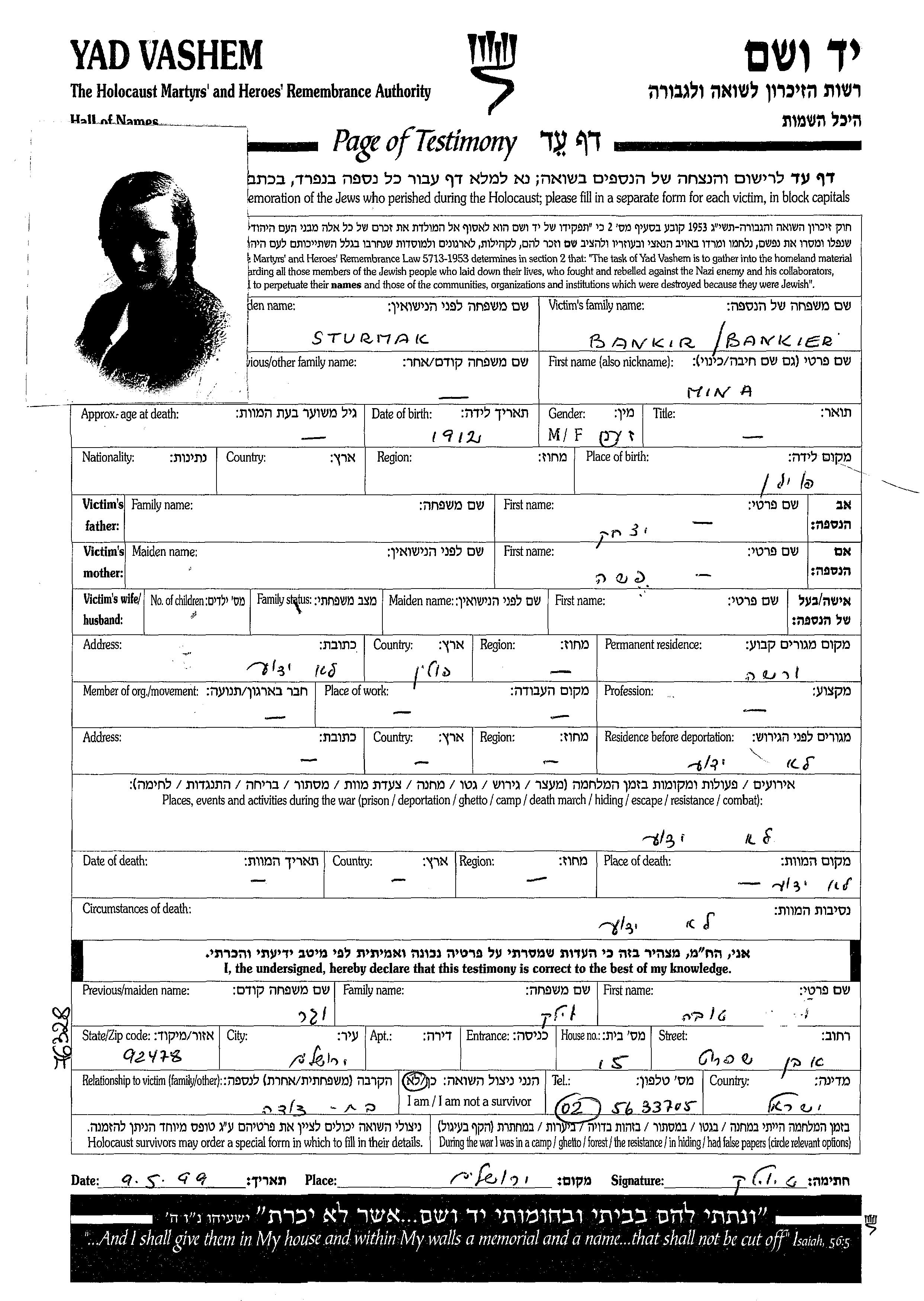 Мина Банкир, девичья фамилия Стурмак, место рождения: Польша. Место жительства до войны: Варшава, Польша.