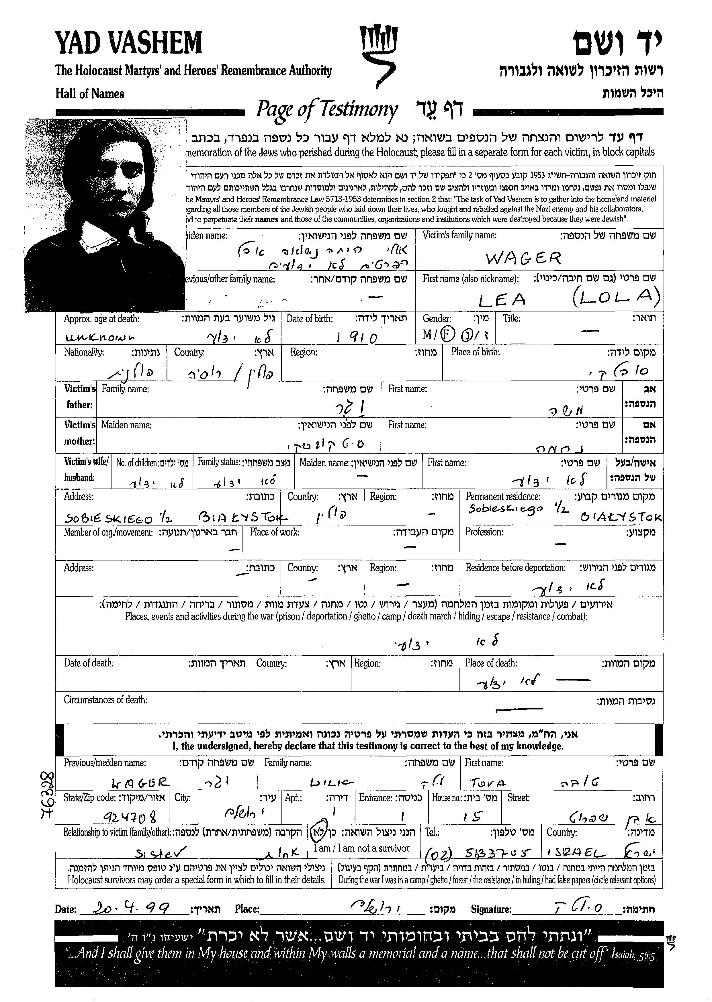 Лея Лола Вагер, место рождения: Сувалки, Польша. Место жительства до войны: Белосток, Польша.