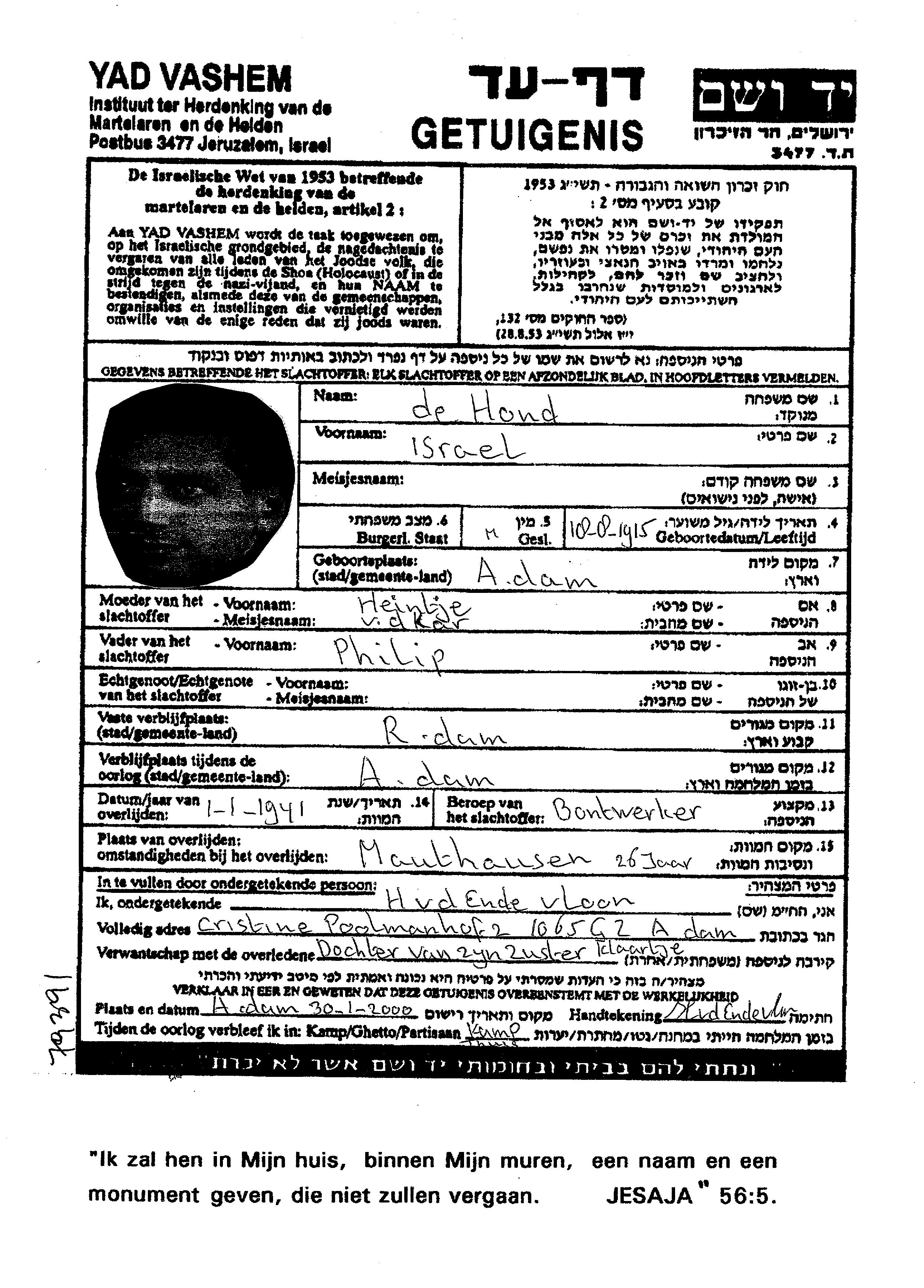Хонд де | Исраэль | 1915 | Роттердам, Нидерланды | Лист свидетельских показаний |