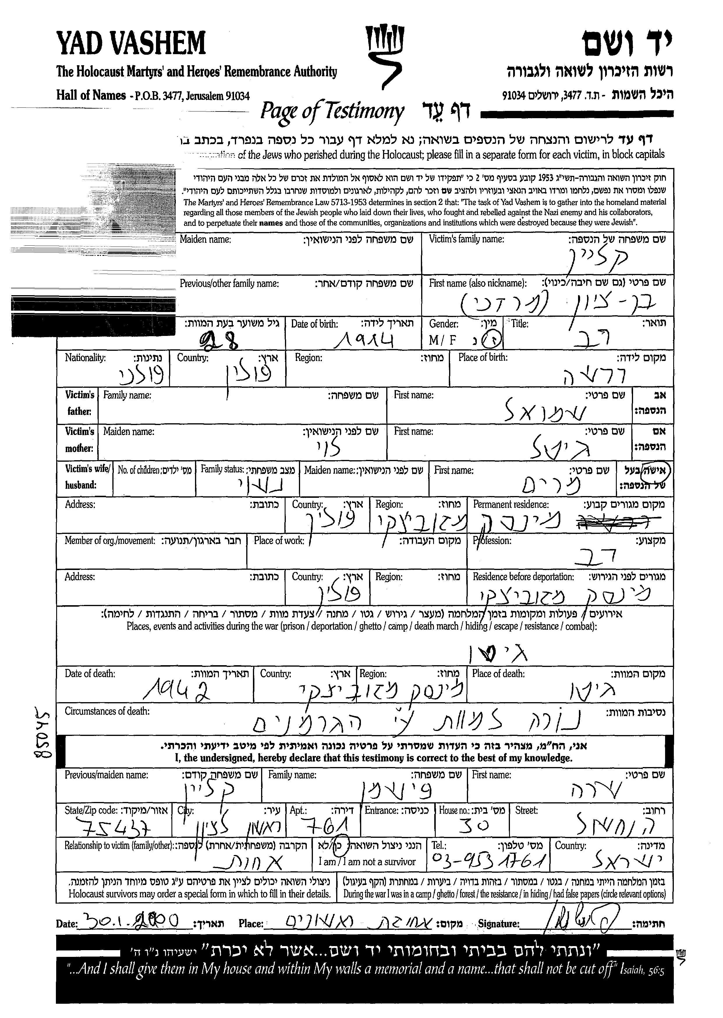 Клейн Бенцион Мордехай 1914 Миньск-Мазовецки, Польша Лист свидетельских показаний