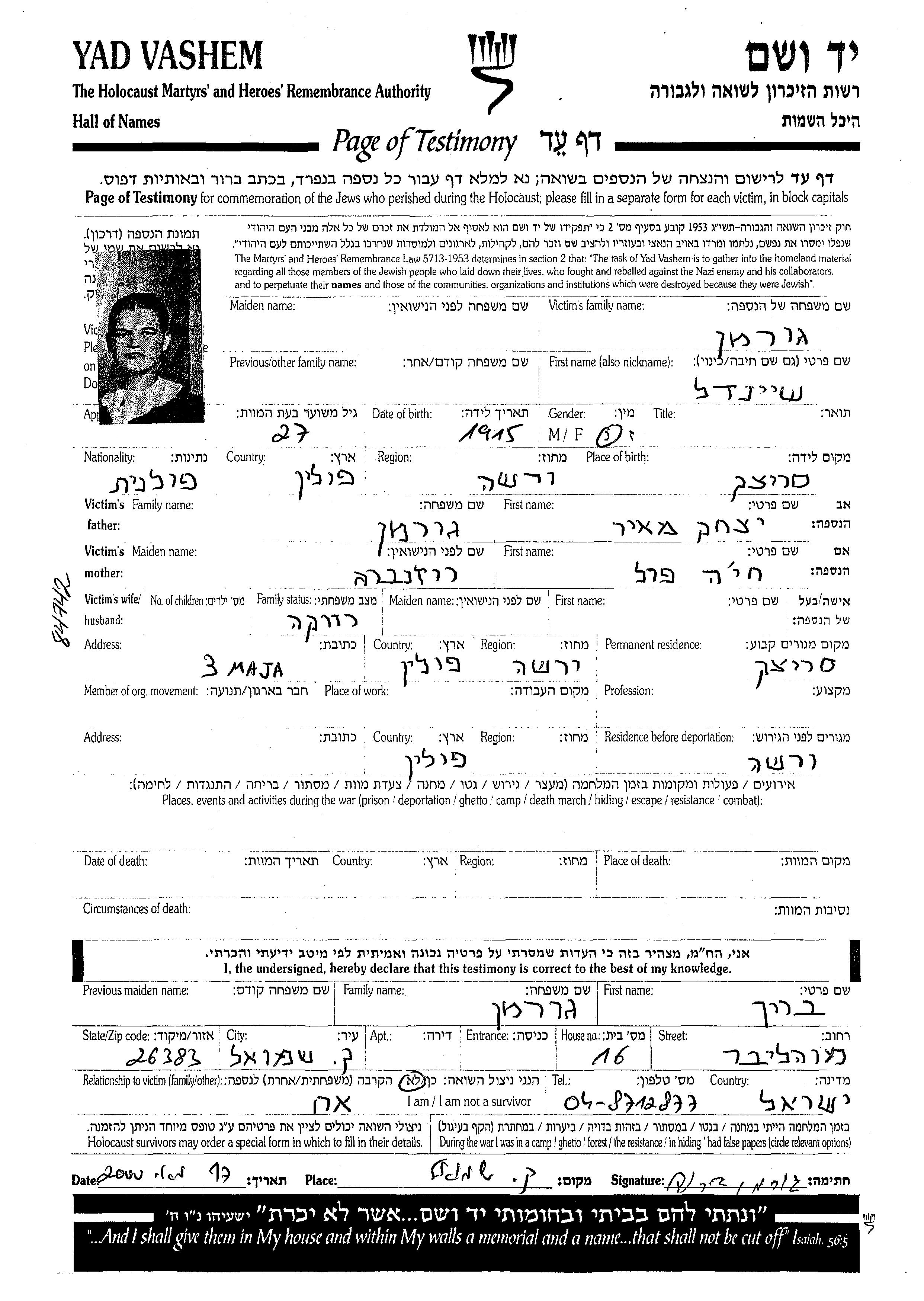 | Гурман | Шейндель | 1915 | Сероцк, Польша | Лист свидетельских показаний |