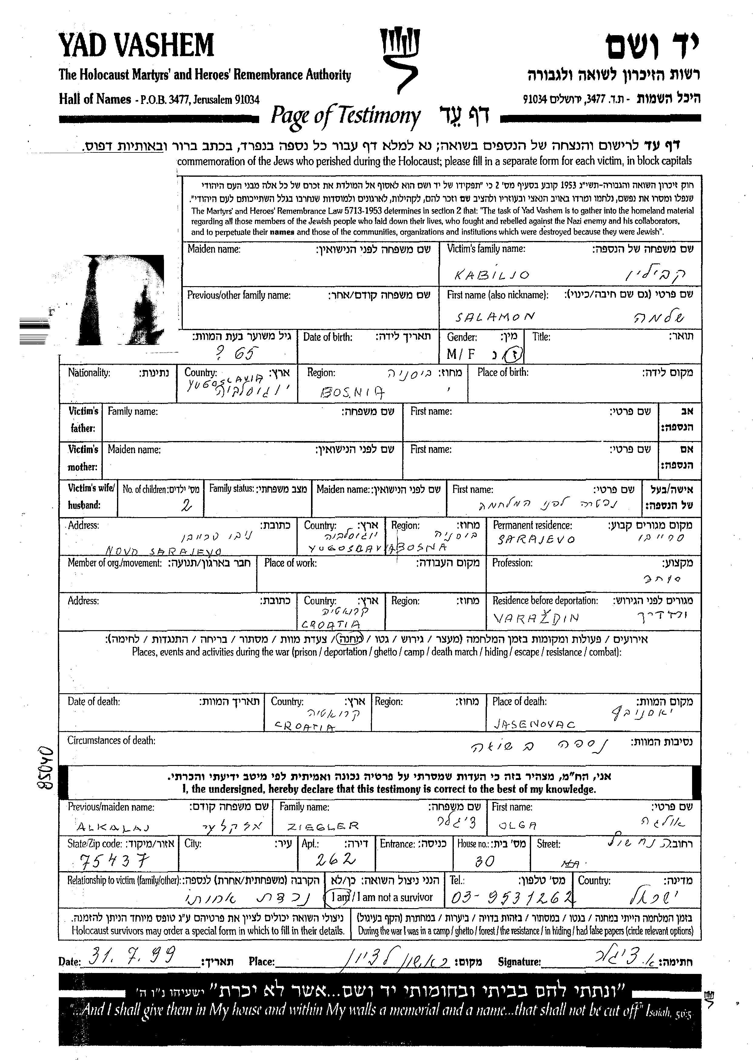 Кабильо Саламон Сараево, Югославия Лист свидетельских показаний
