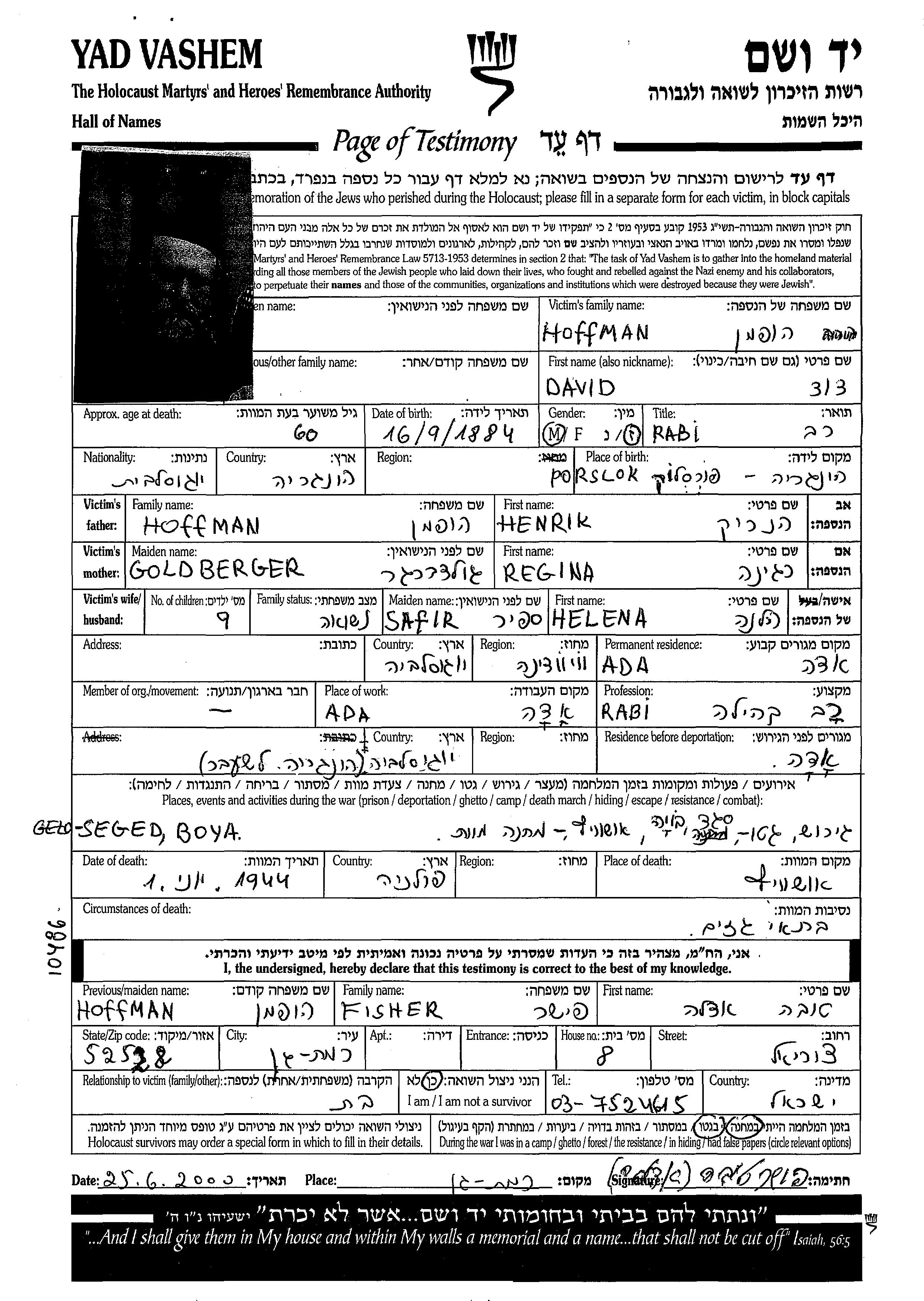 Хоффман Давид 1884 Ада, Югославия Лист свидетельских показаний