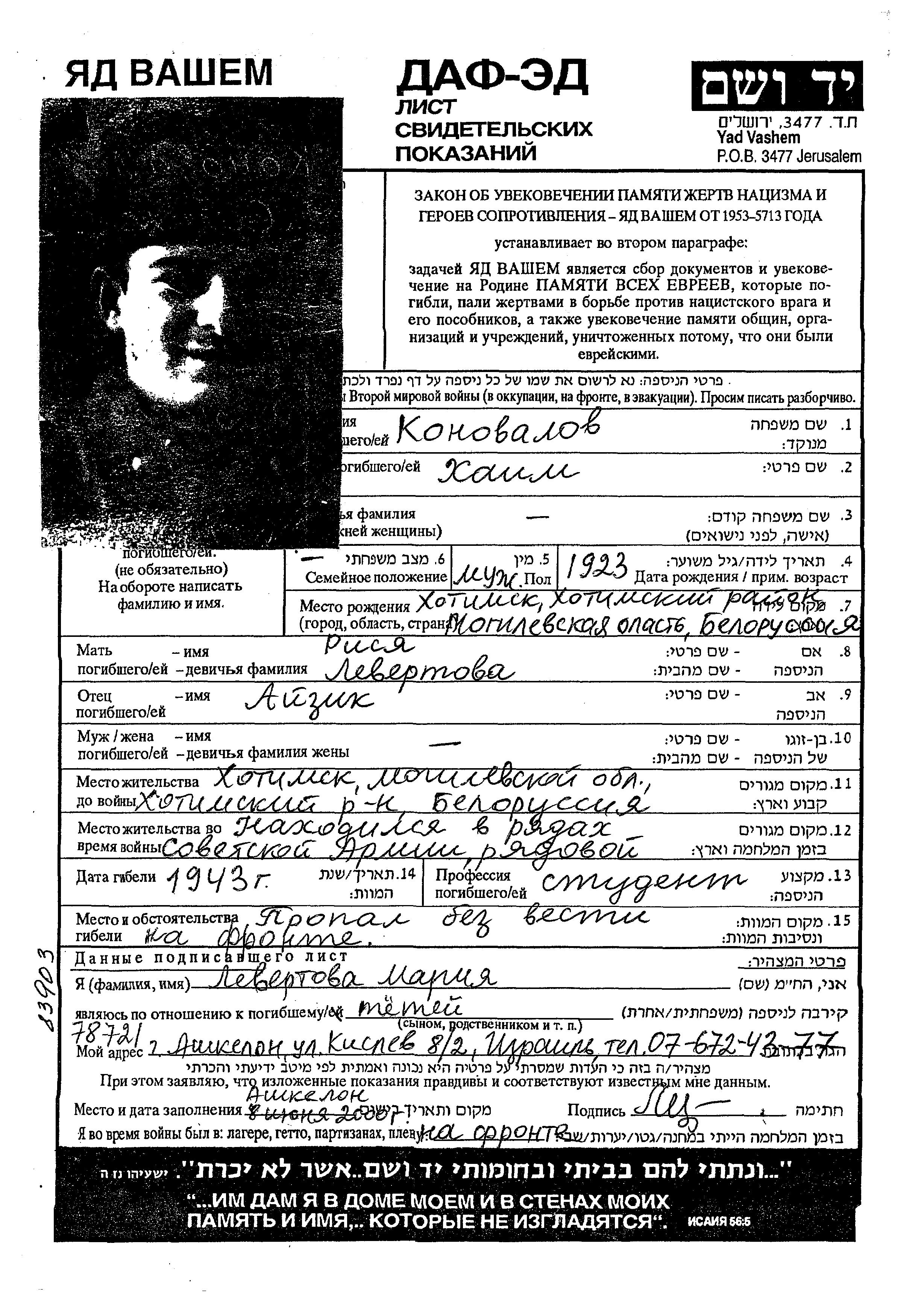 Коновалов Хаим 1923 Хотимск, Белоруссия (СССР) Лист свидетельских показаний