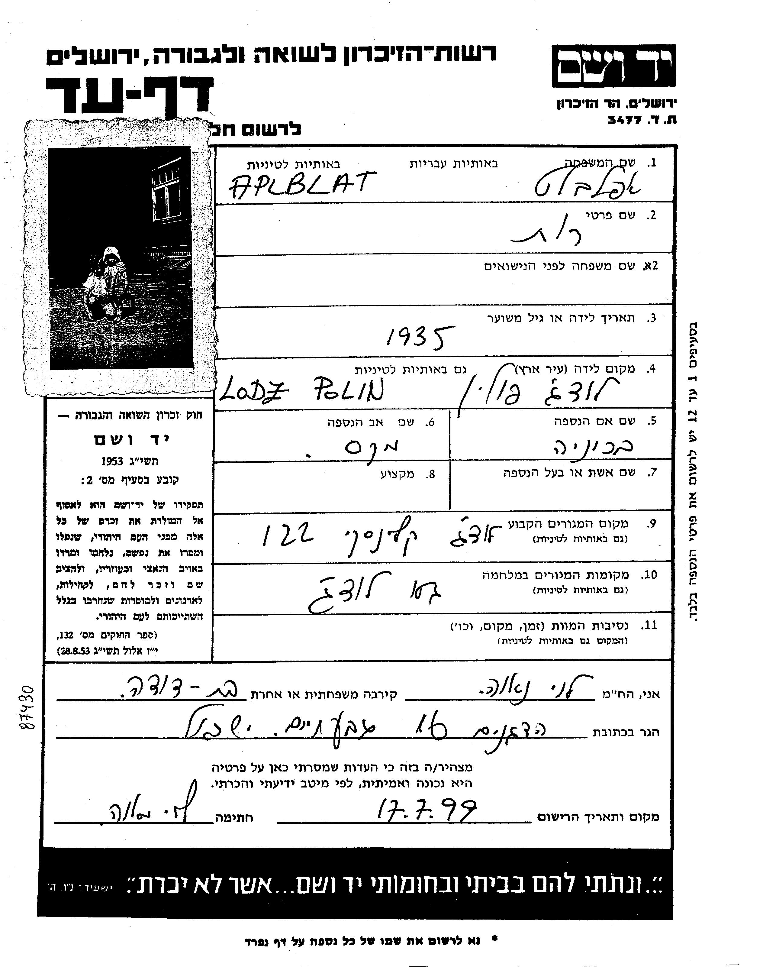 Рут Апльблат, место рождения: Лудзь, Польша. Место жительства до войны: Лудзь, Польша.