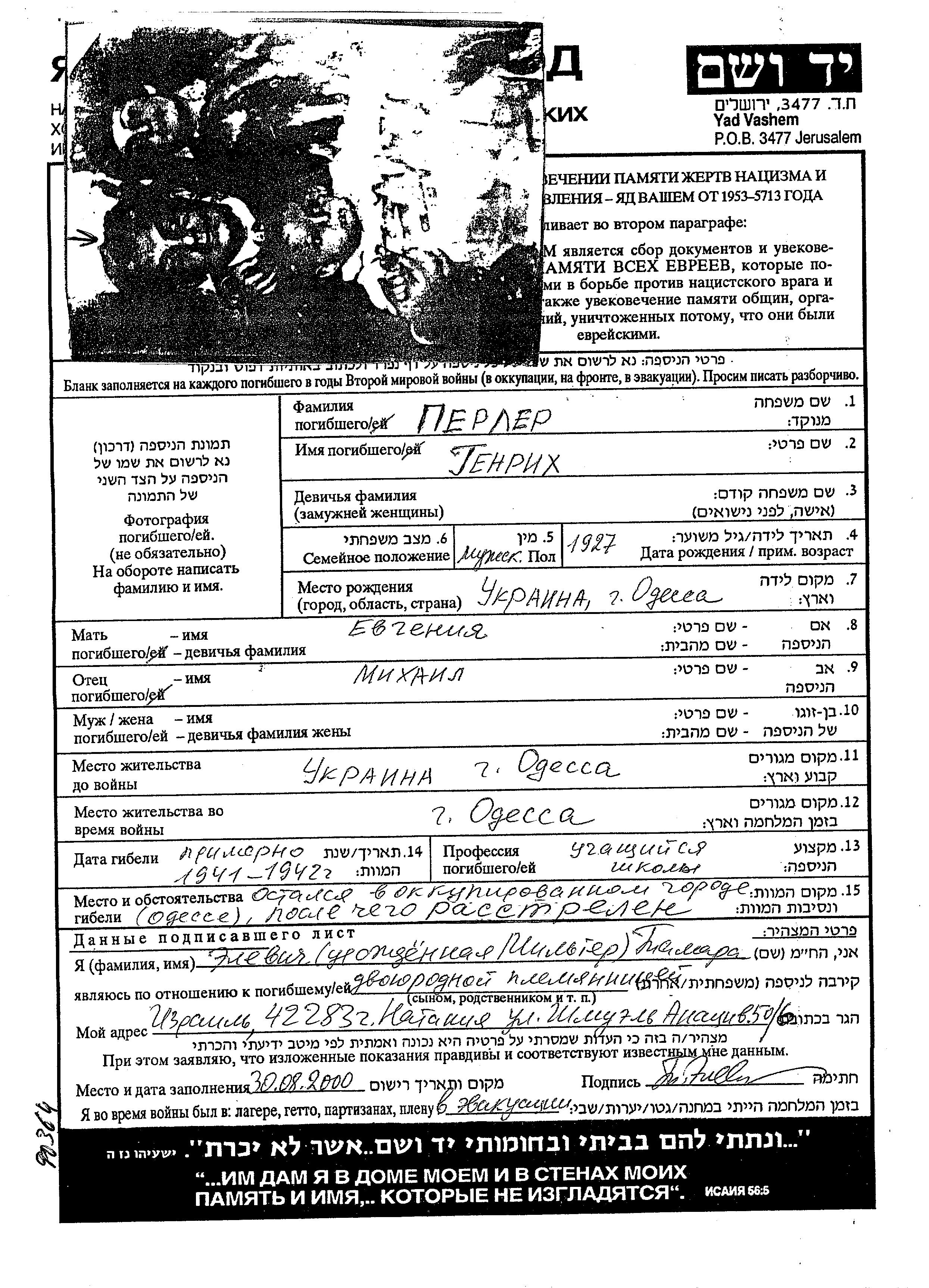 Перлер Генрих 1927 Одесса, Украина (СССР) Лист свидетельских показаний