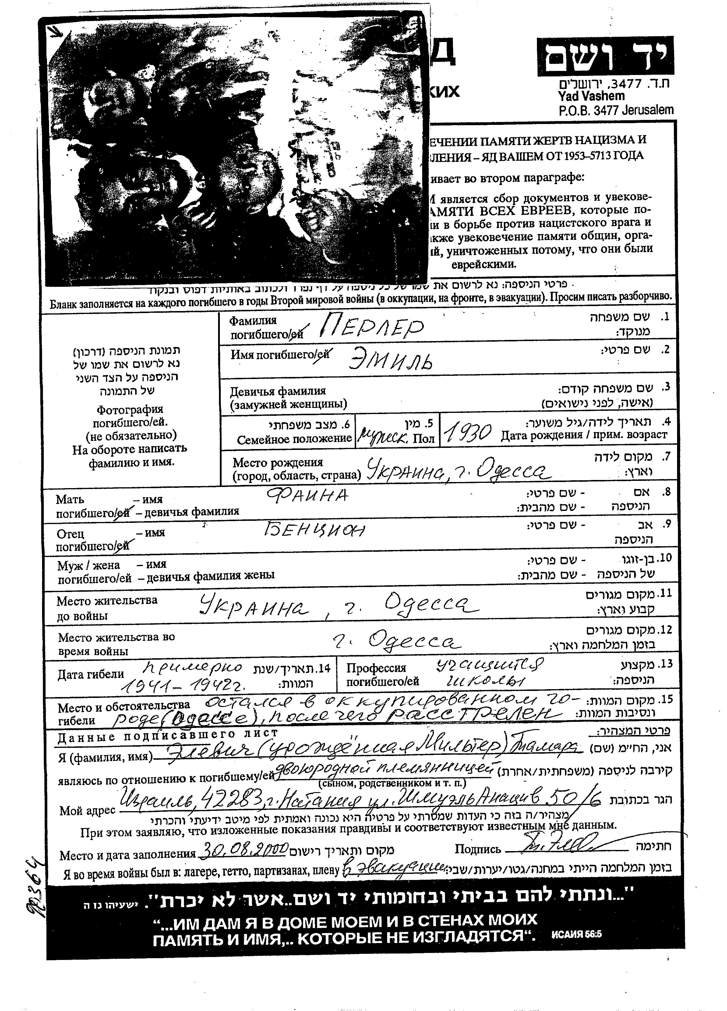 | Перлер | Эмиль | 1930 | Одесса, Украина (СССР) | Лист свидетельских показаний |