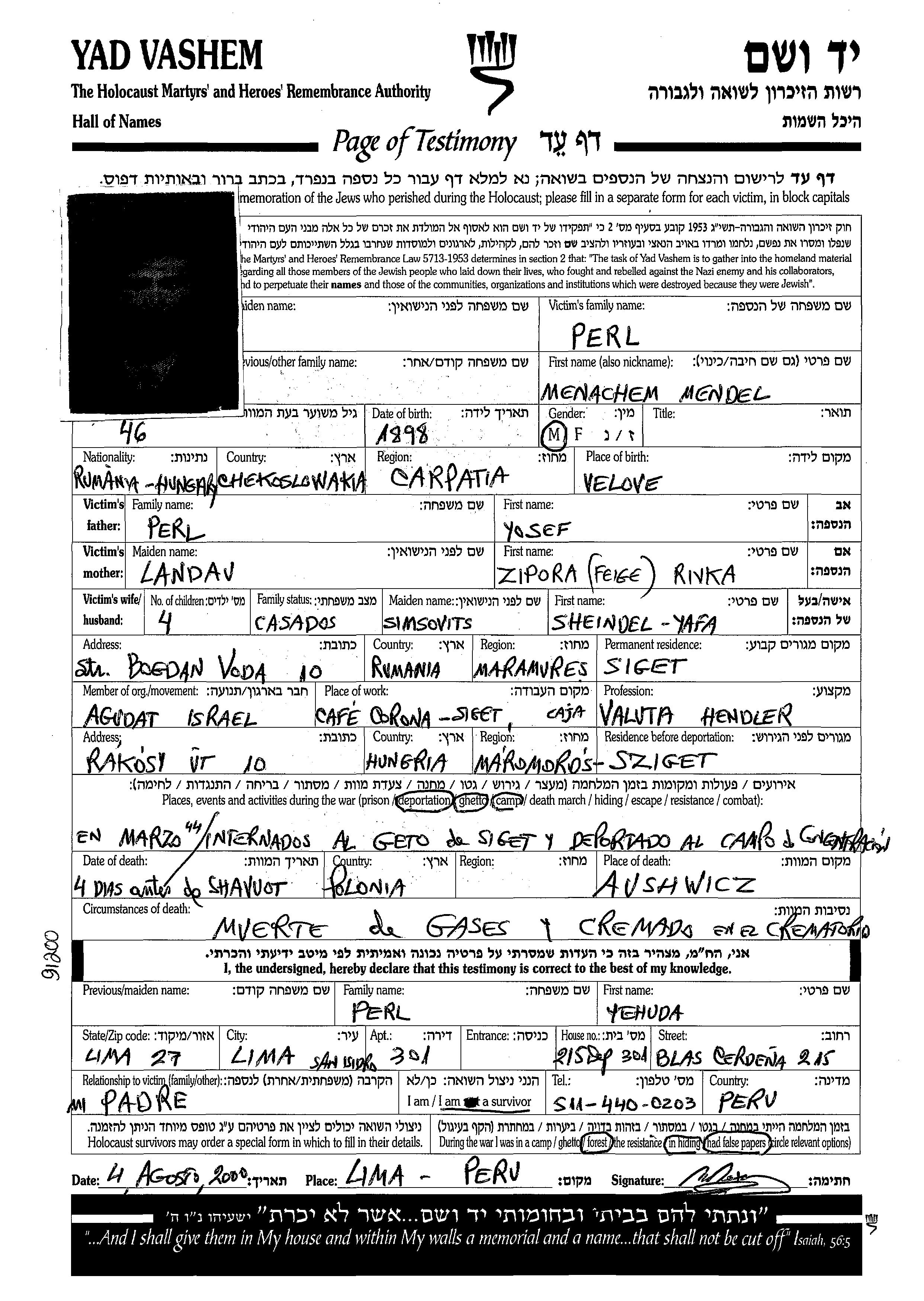 | Перль | Менахем Мендель | 1898 | Сигет, Румыния | Лист свидетельских показаний |