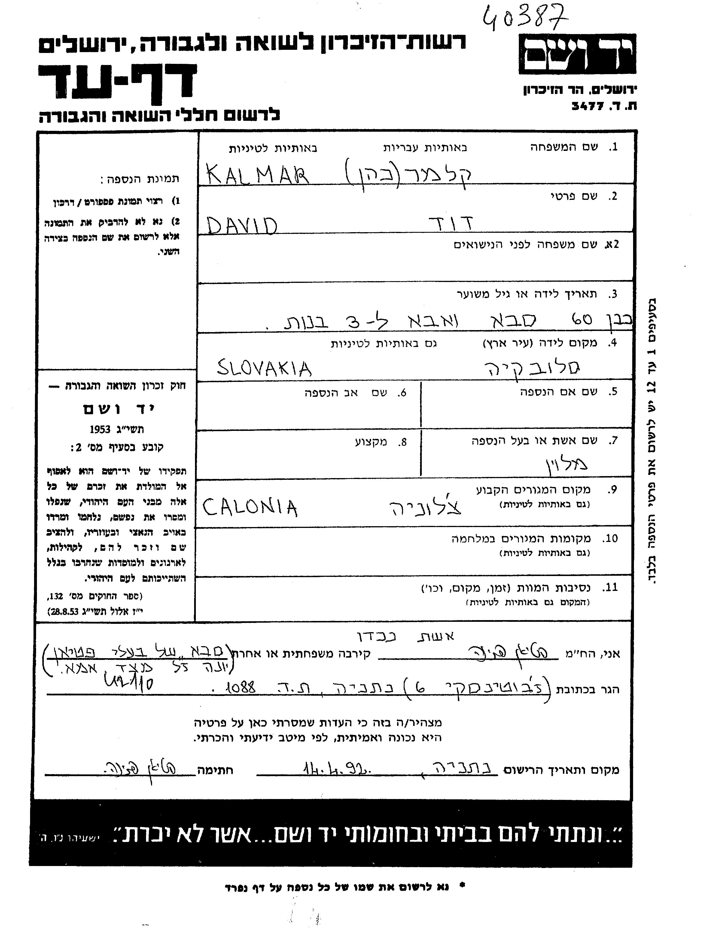 Давид Кальмар, место рождения: Словакия, Чехословакия. Место жительства до войны: Чалониа, Чехословакия.