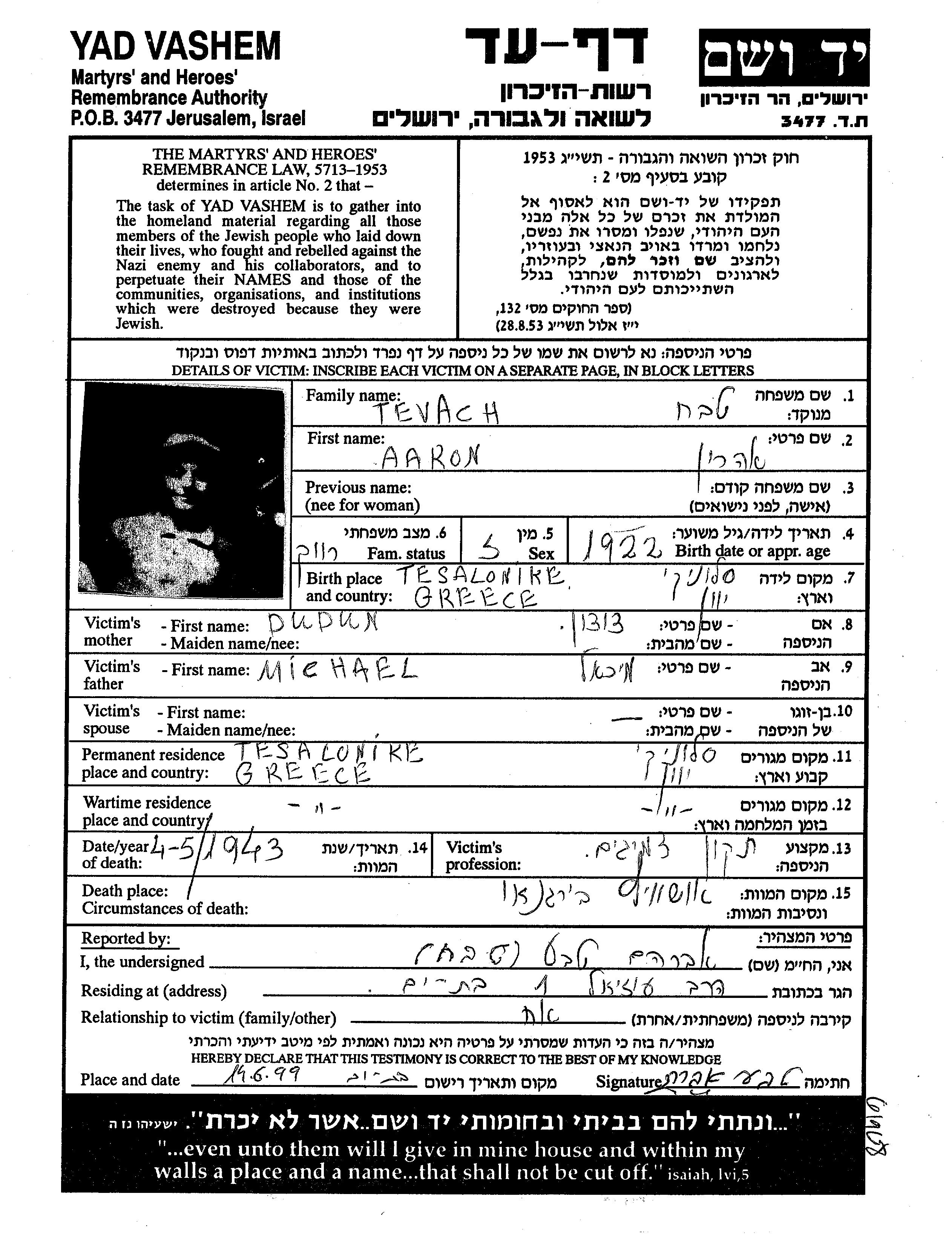 Аарон Тевах, место рождения: Салоники, Греция. תיקון צמיגים. Место жительства до войны: Салоники, Греция.