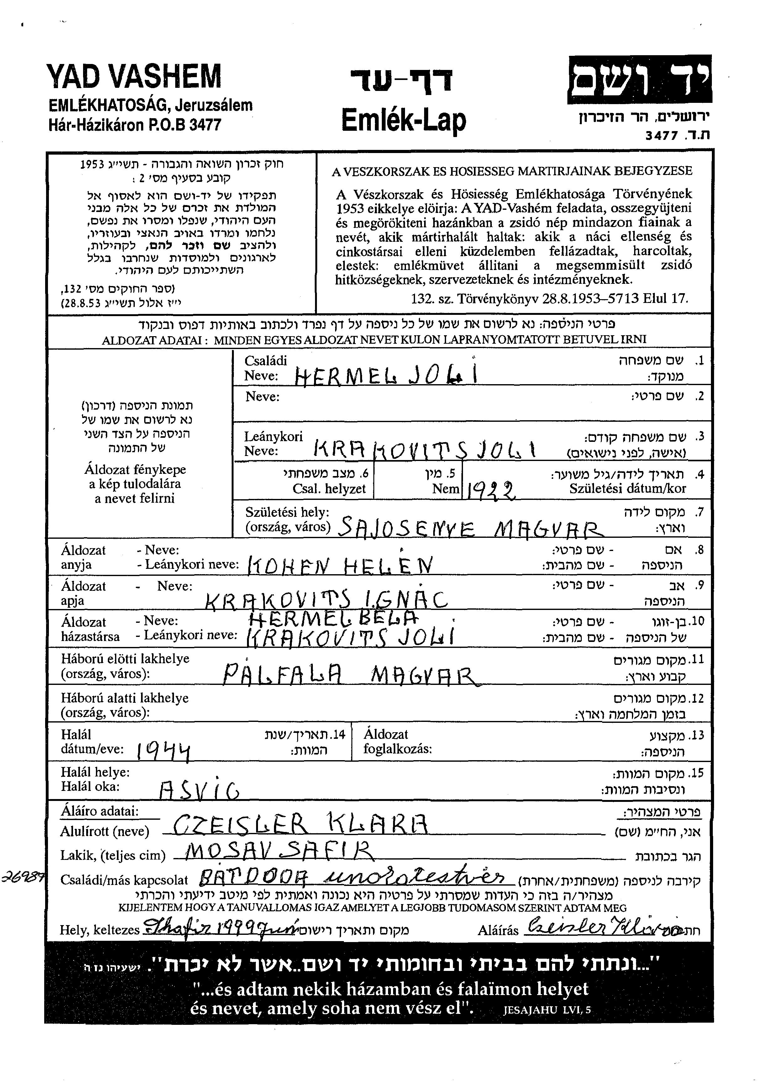 Йолан Хермель, девичья фамилия Краковиц, место рождения: Шайошенье, Венгрия. Место жительства до войны: Sajopalfala, Венгрия.