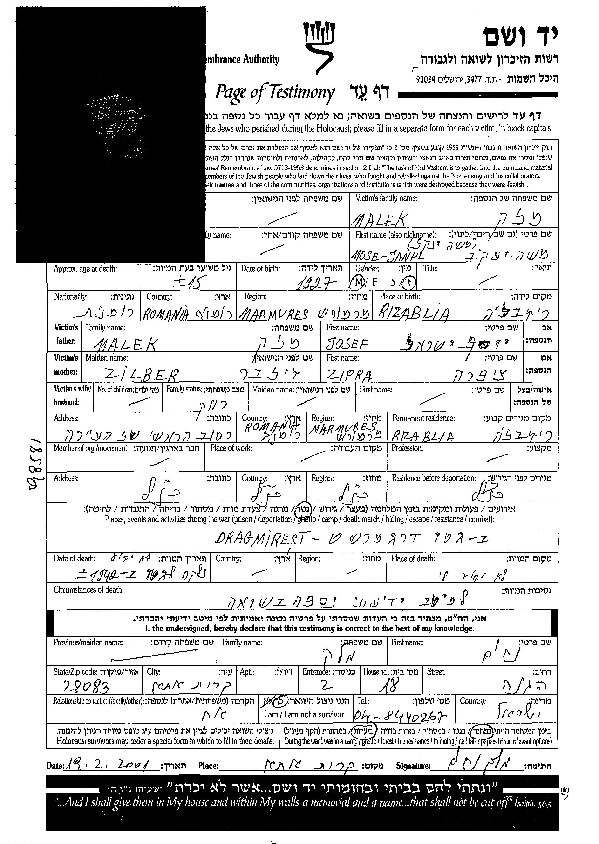 Малек Моше Янкл 1927 Розавля, Румыния Лист свидетельских показаний