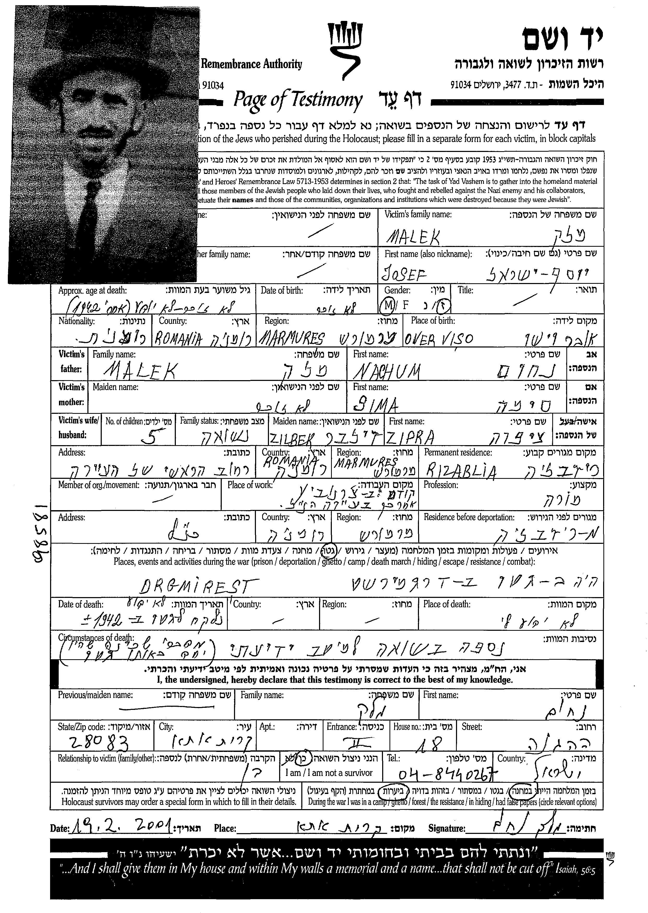 Малек | Йосеф Исраэль | Розавля, Румыния | Лист свидетельских показаний | |