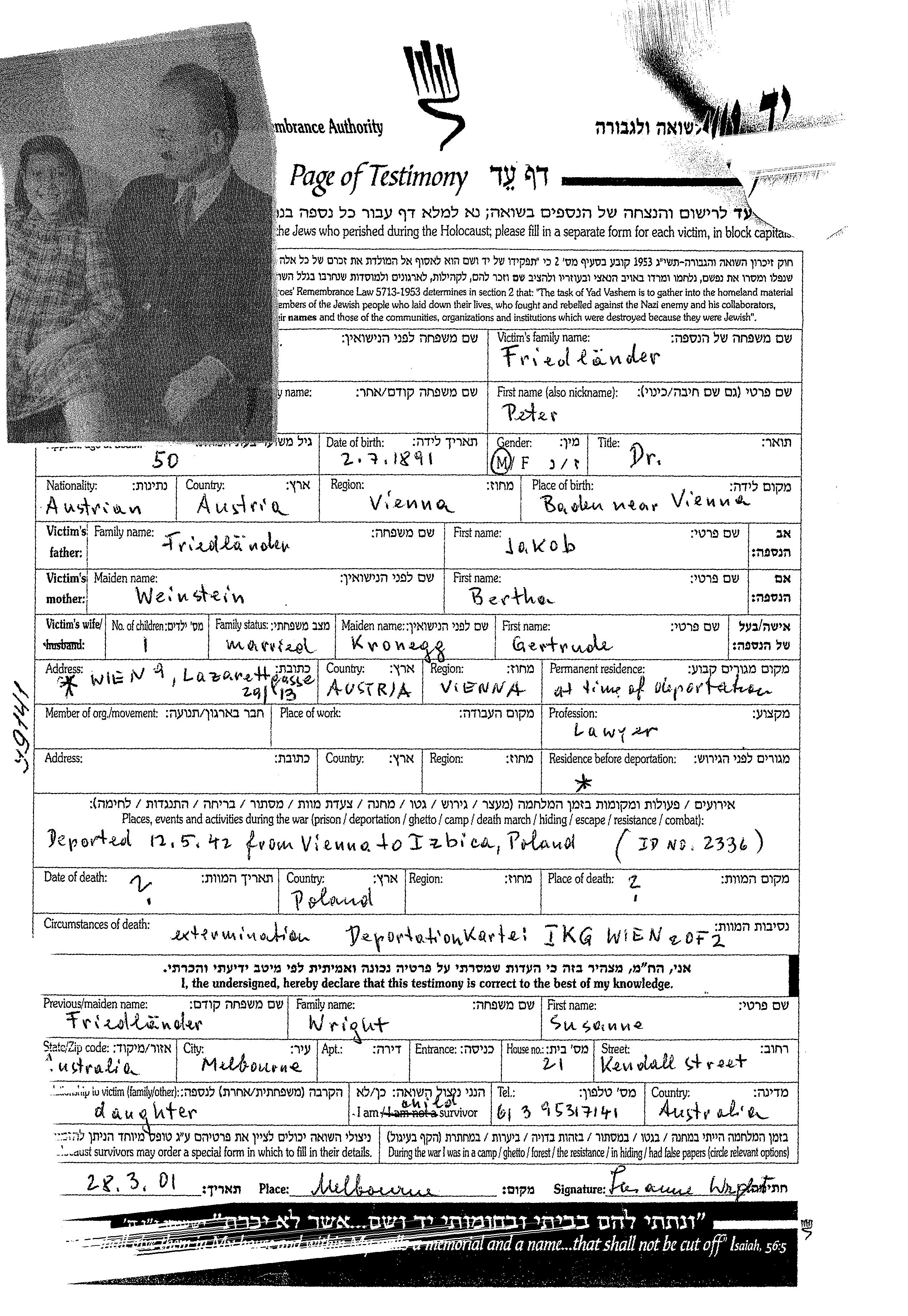 Фридлендер | Петер | 1891 | Вена, Австрия | Лист свидетельских показаний |