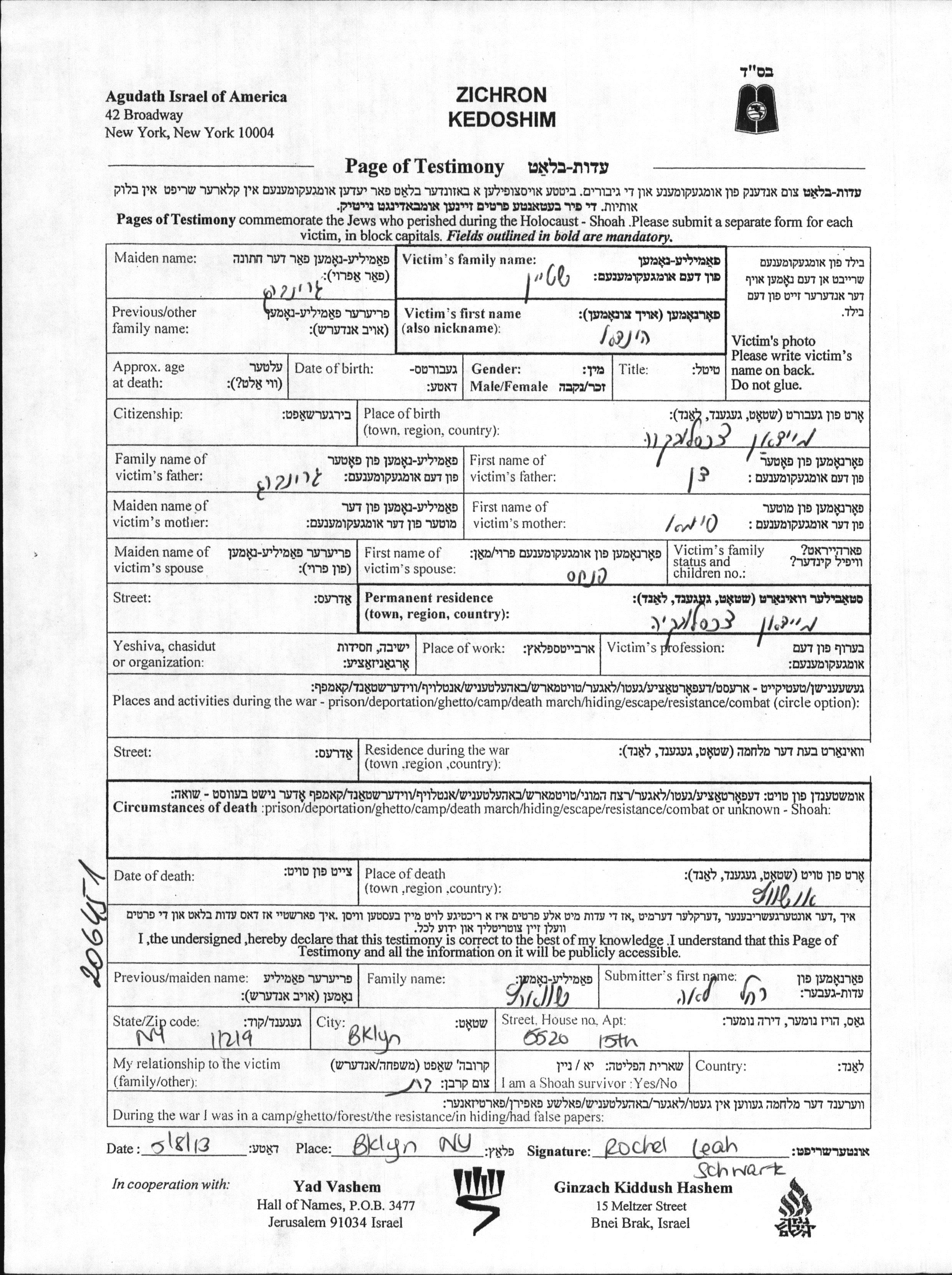 Яд Вашем - Листы свидетельских показаний Мемориального фонда