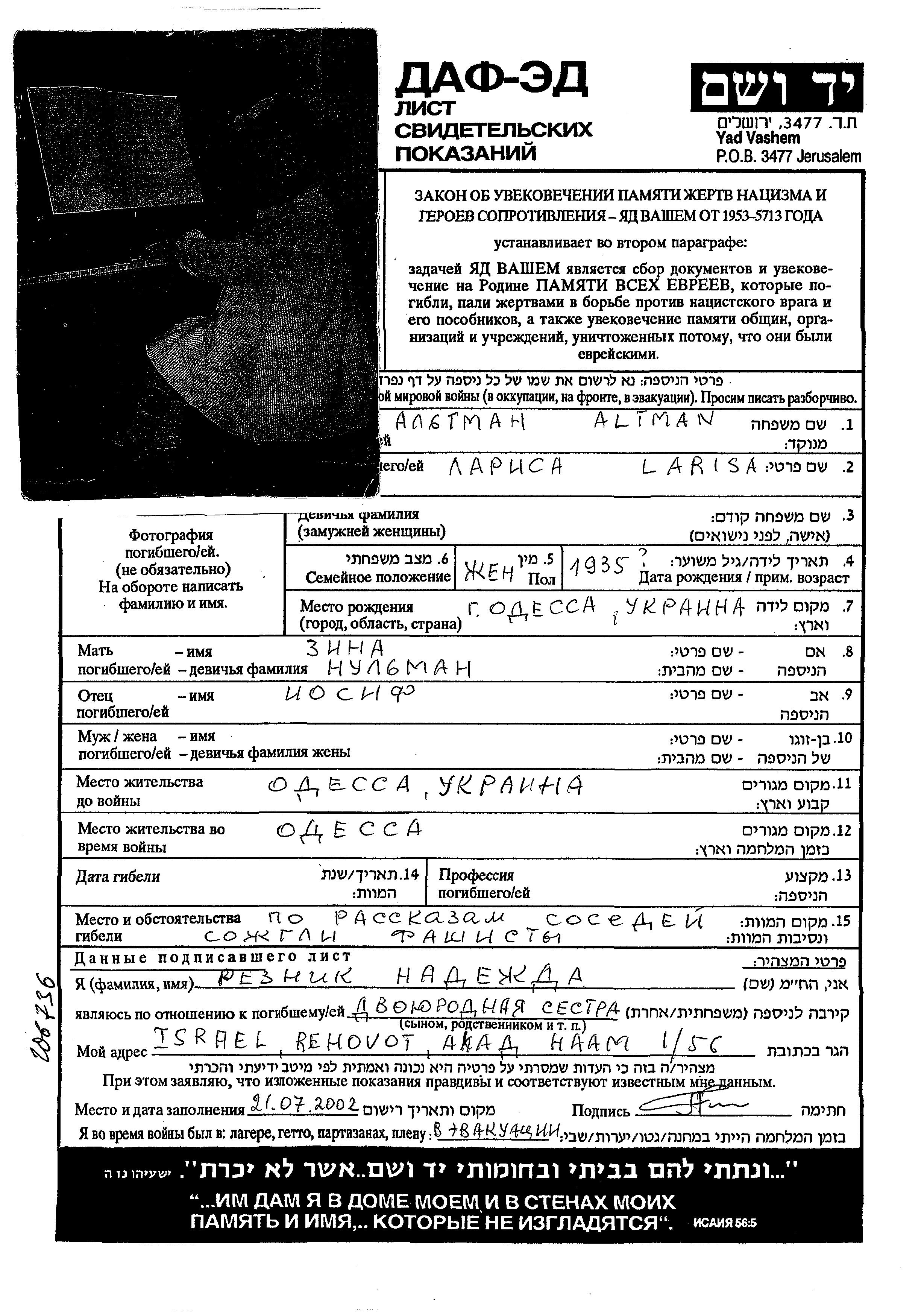 Яд Вашем - Листы свидетельских показаний Мемориального фонда