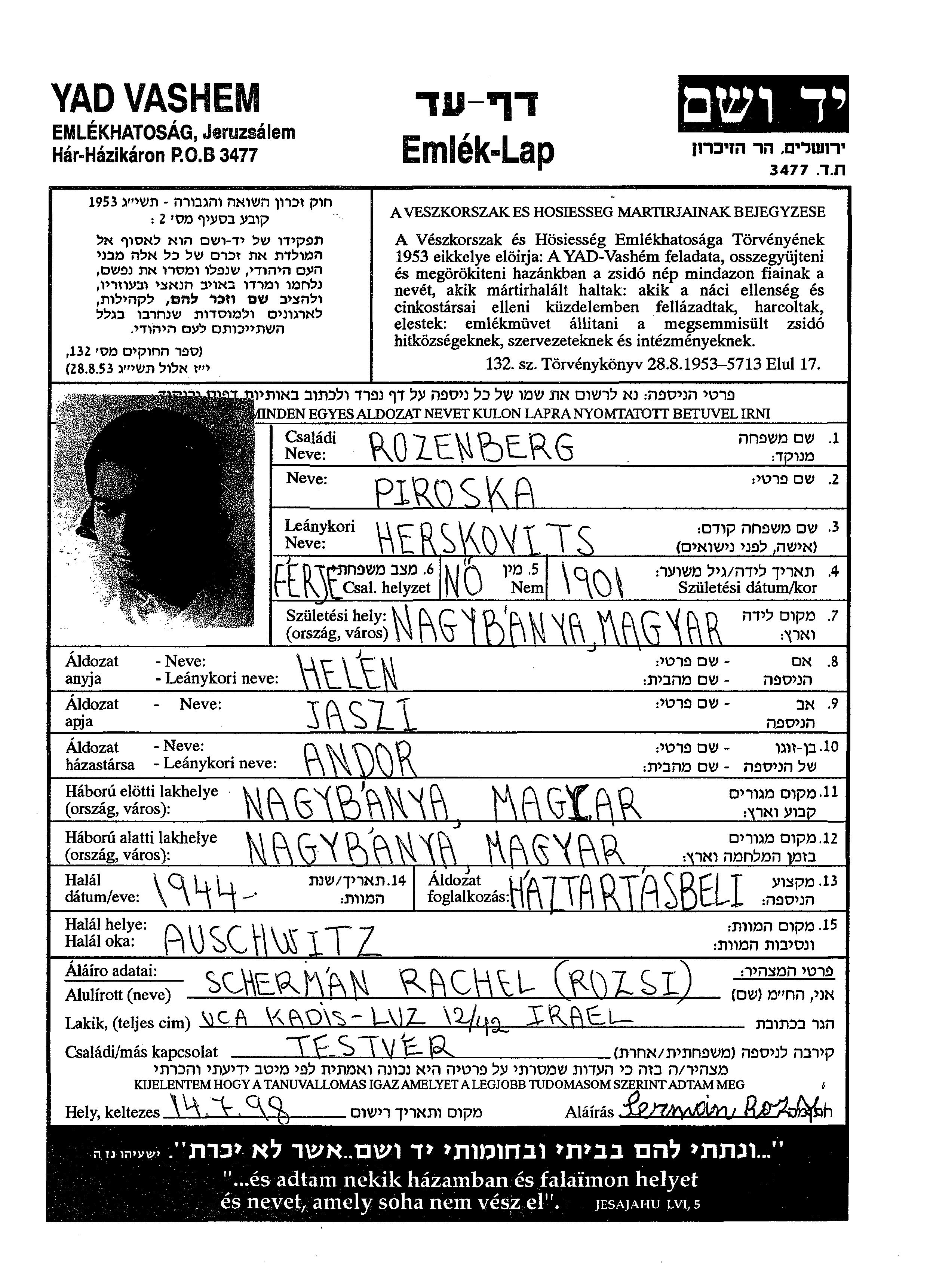 Пироска уничтоженa в период Шоа. место смерти: Аушвиц, Польша в 1944.