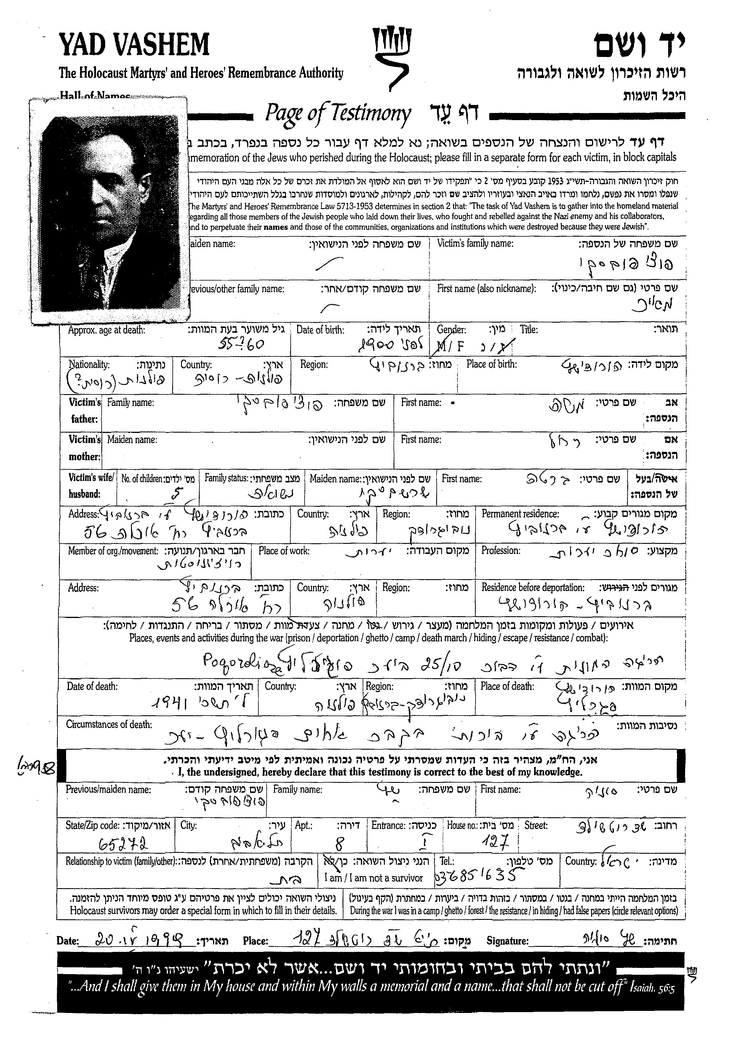 Меир Почиповски, место рождения: Городище, Польша. Лесоторговец. Место жительства до войны: Городище, Польша.