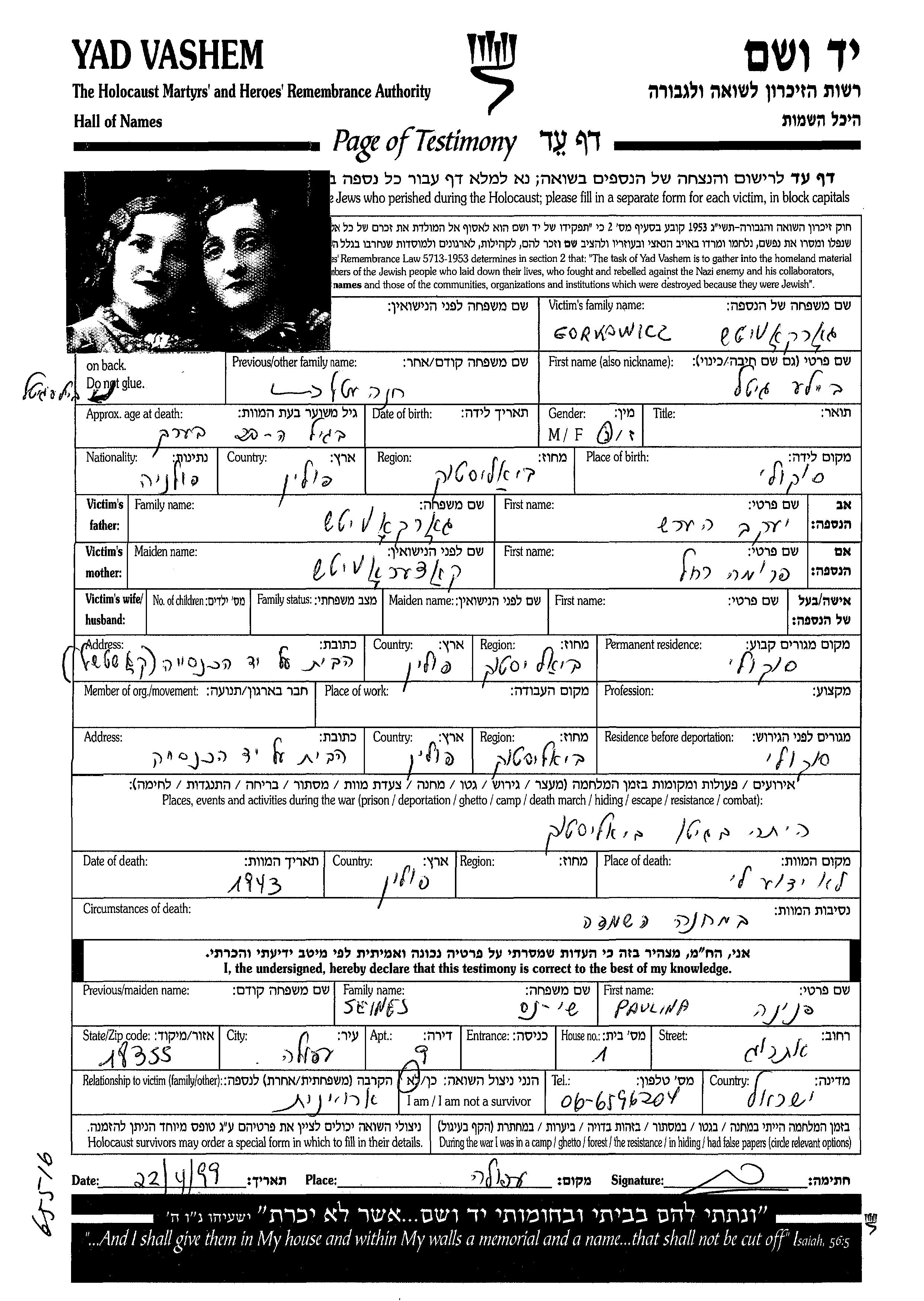 Гитель Бейла Коркавич, место рождения: Соколы, Польша. Место жительства до войны: Соколы, Польша.
