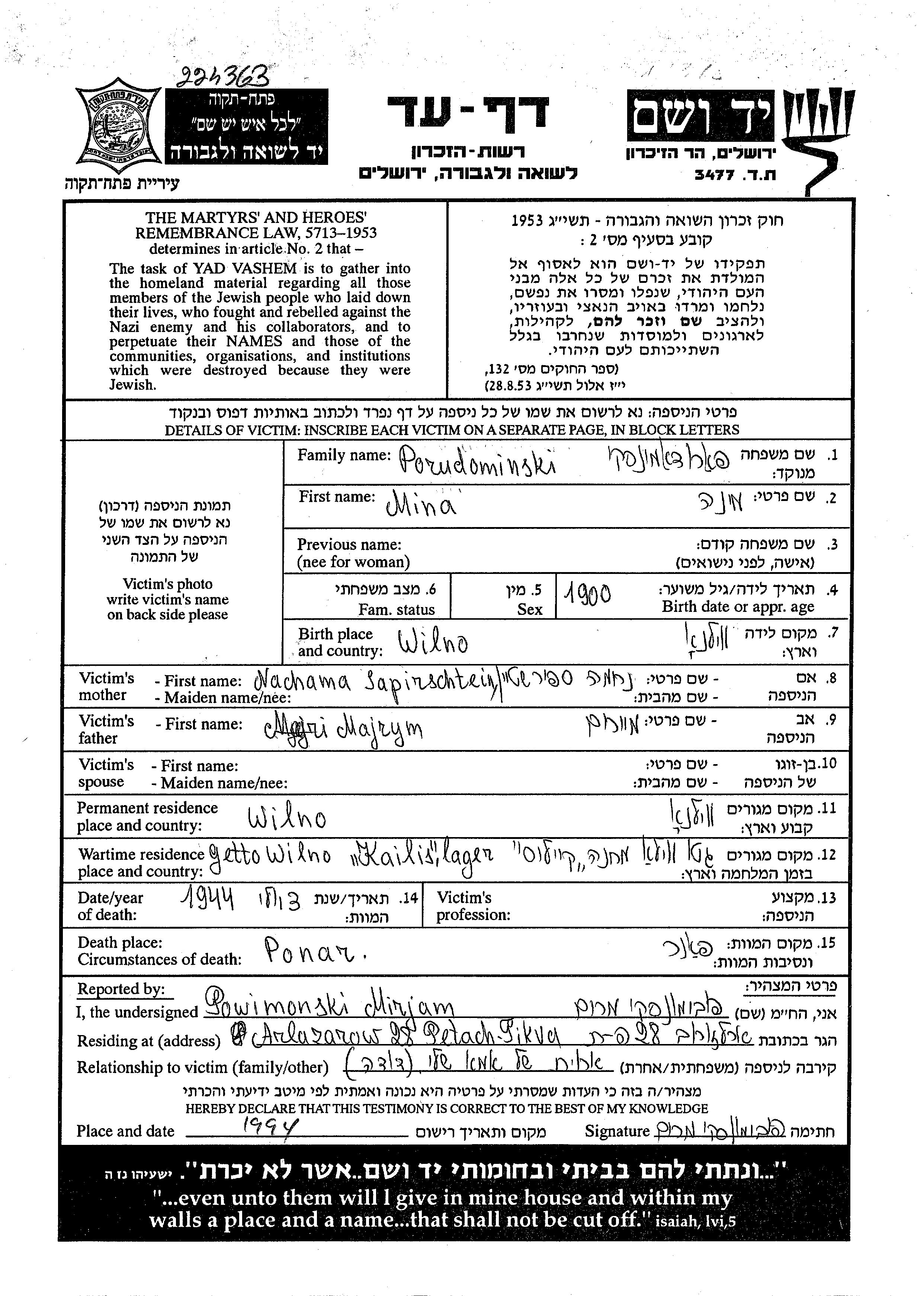 Мина Порудомински, место рождения: Вильно, Польша. Лаборант. Место жительства до войны: Вильно, Польша.