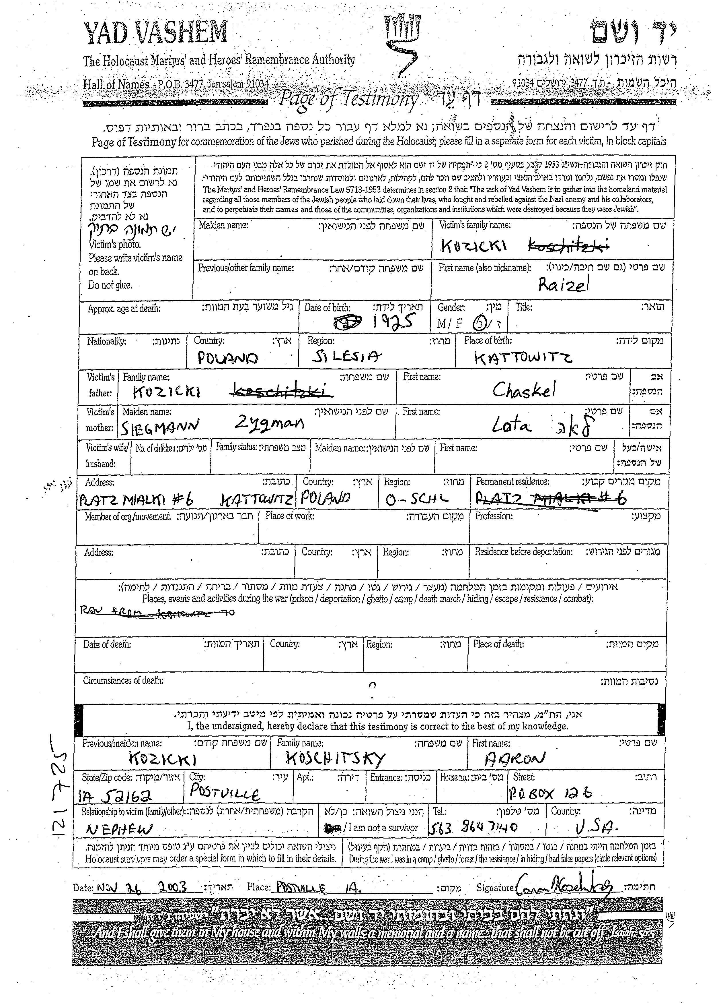 Козицки | Райзел | 1925 | Катовице, Польша | Лист свидетельских показаний |