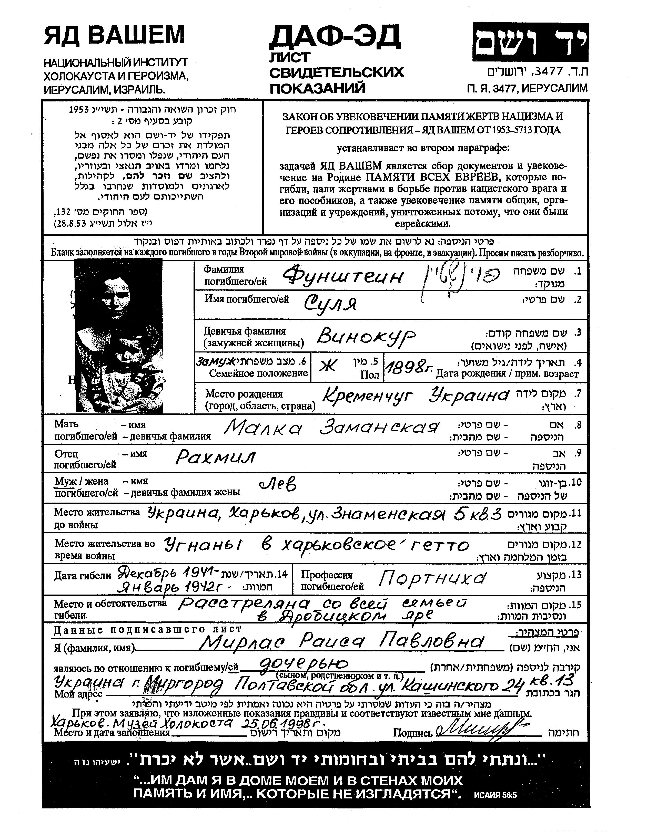 Яд Вашем - Листы свидетельских показаний Мемориального фонда