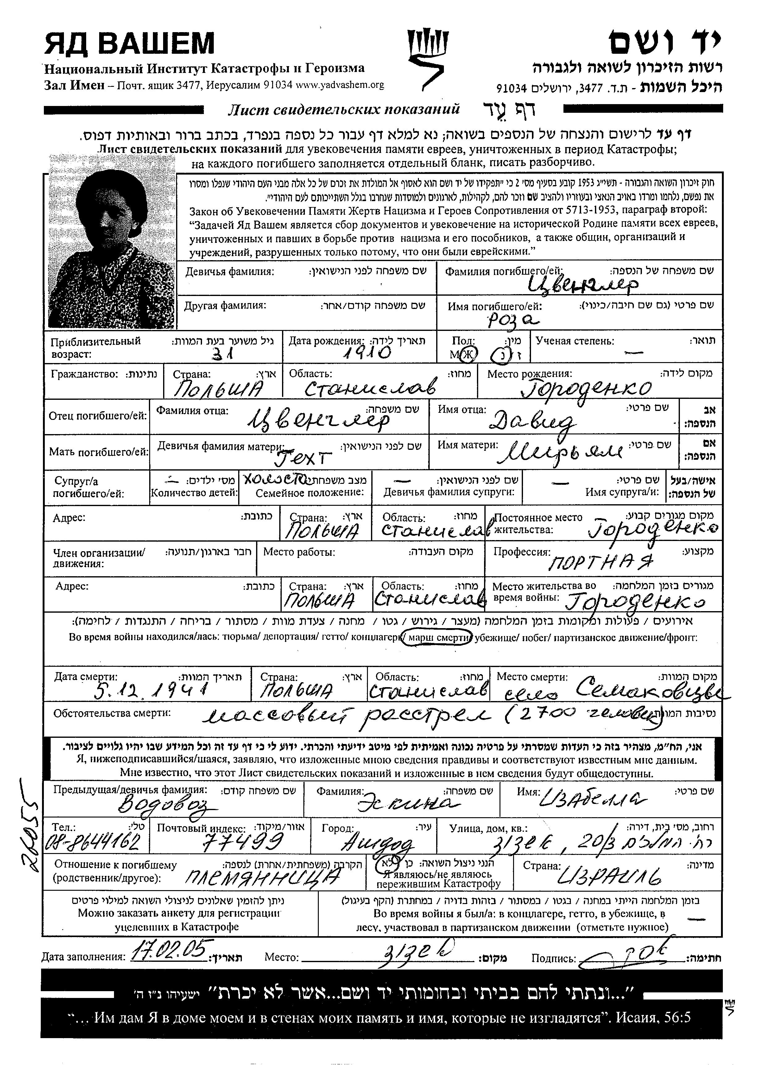 Яд Вашем - Листы свидетельских показаний Мемориального фонда
