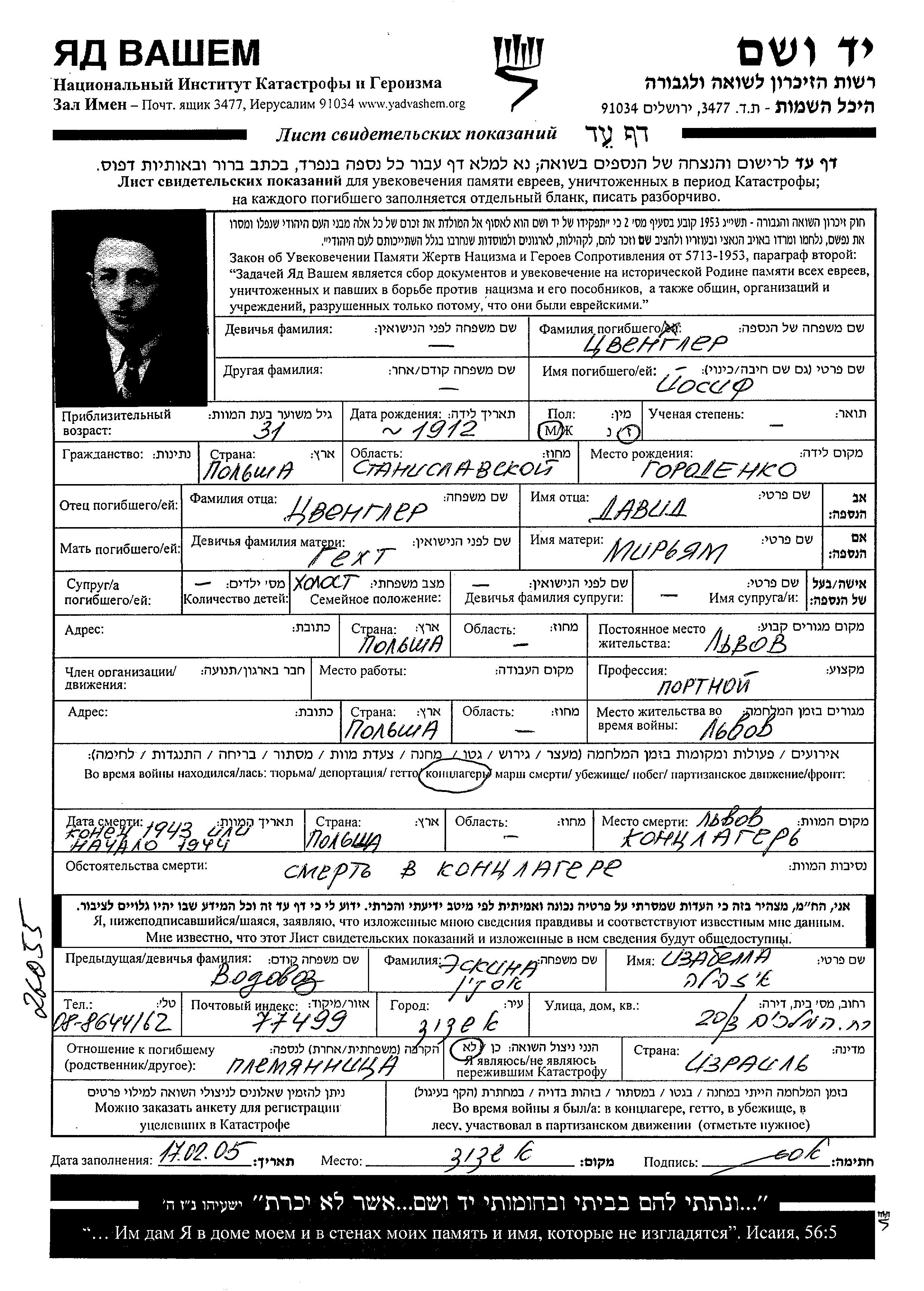 Яд Вашем - Листы свидетельских показаний Мемориального фонда