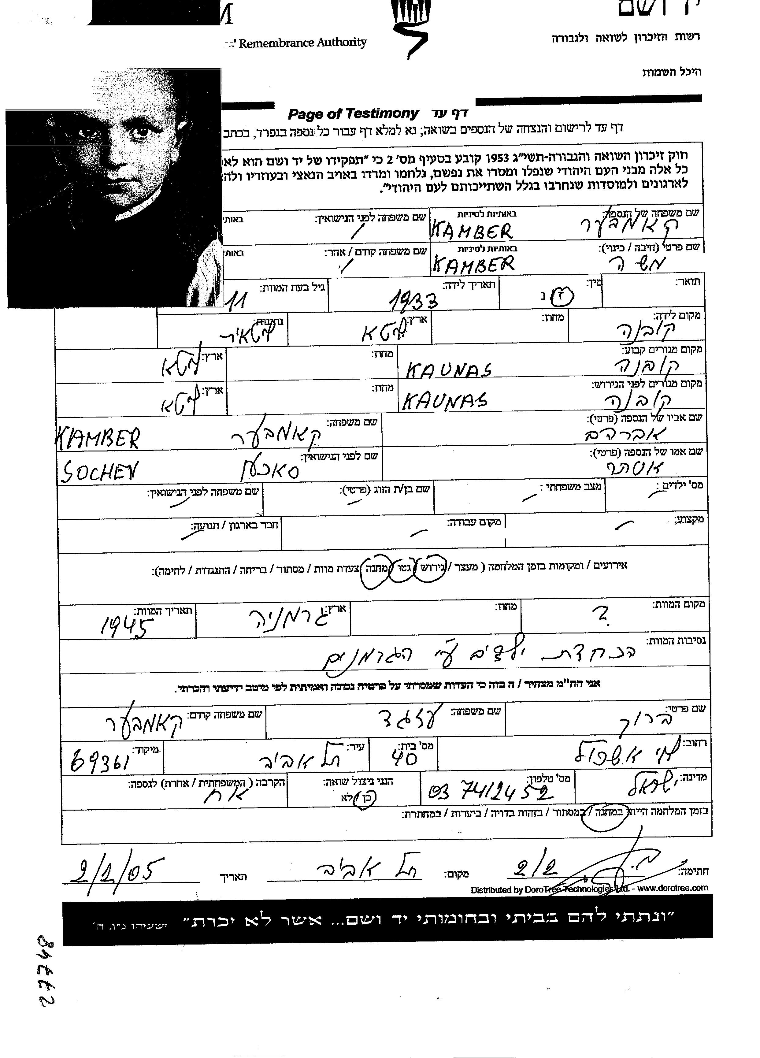 Моше Камбер, место рождения: Каунас, Литва. Место жительства до войны: Каунас, Литва.