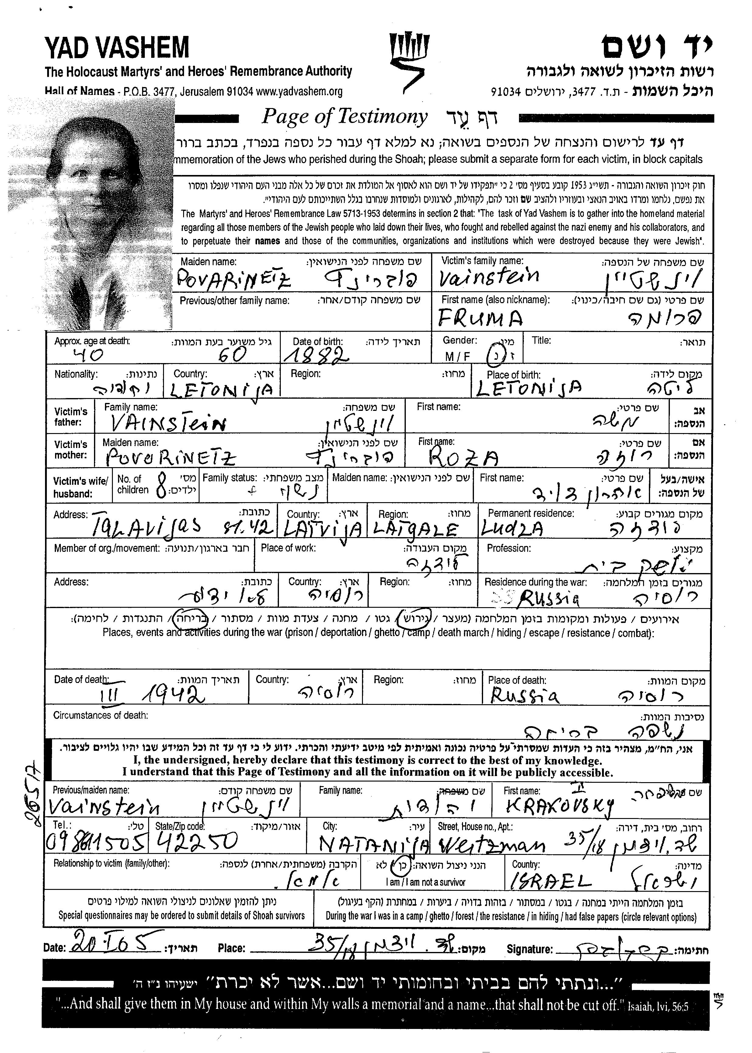 Фрума Вайнштейн, девичья фамилия Поваринец, место рождения: Литва. Место жительства до войны: Лудза, Латвия.