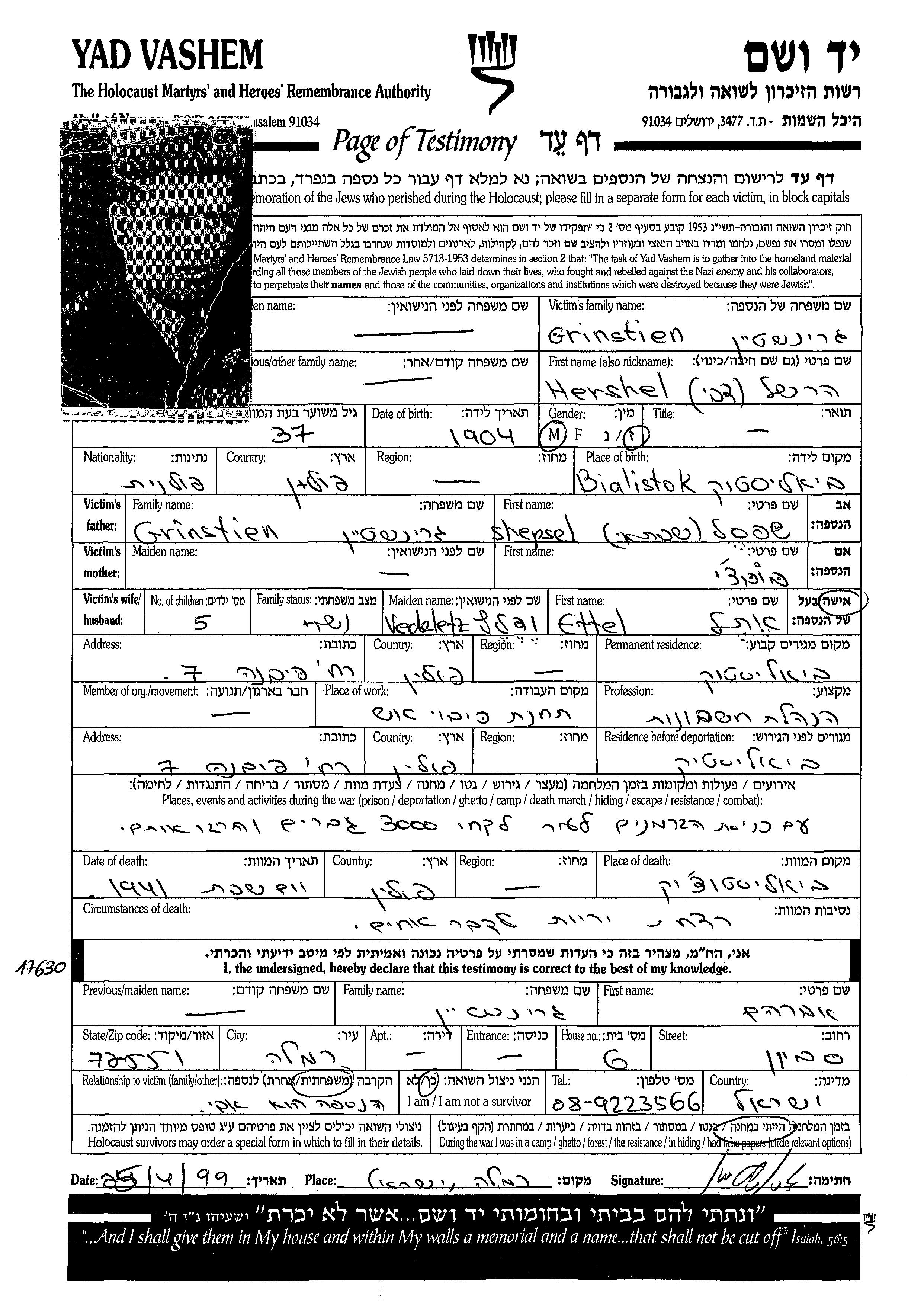 Гринштен Цви Гершель 1904 Белосток, Польша Лист свидетельских показаний