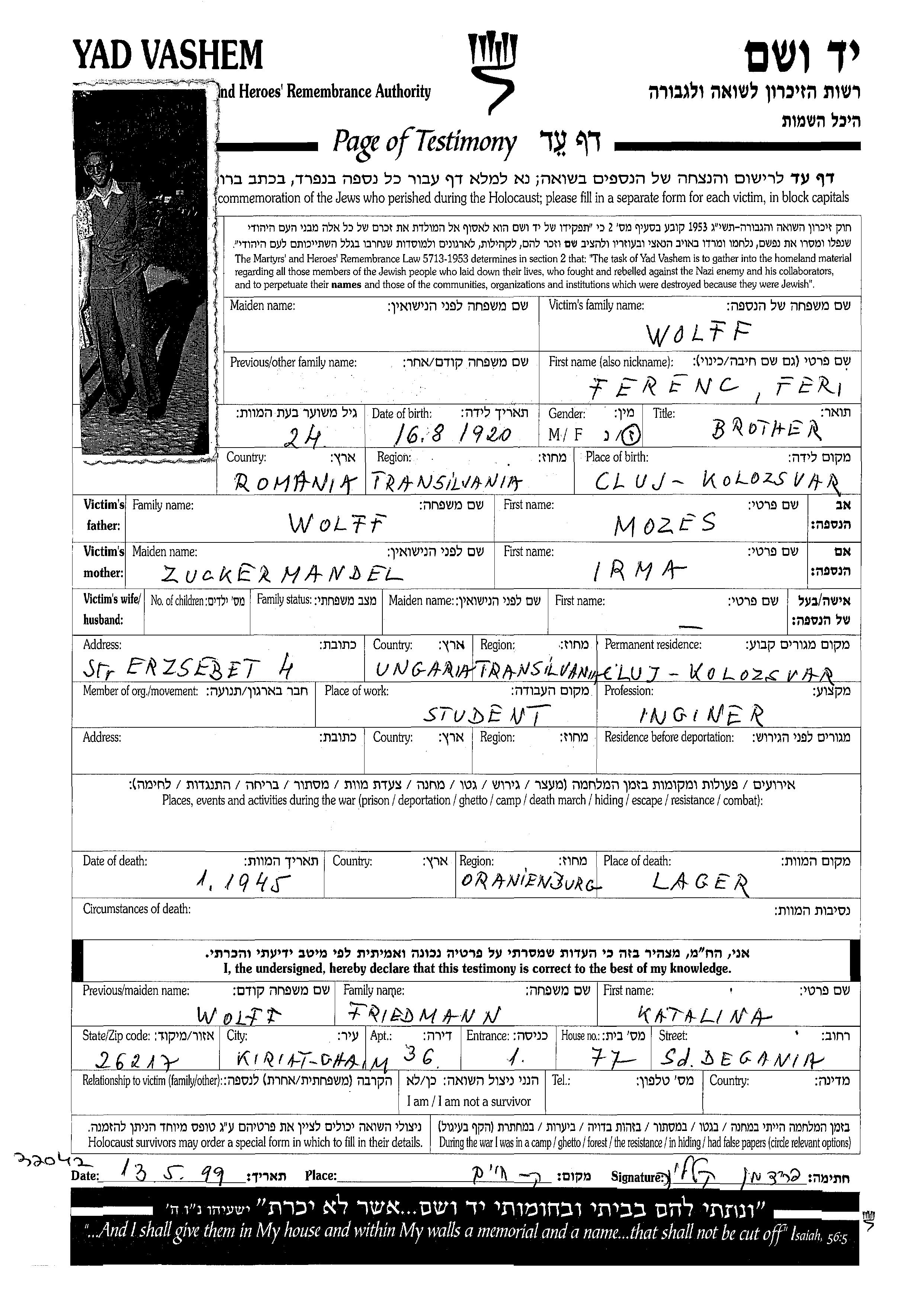 Ференц Вольф, место рождения: Клуж, Румыния. Место жительства до войны: Клуж, Румыния.