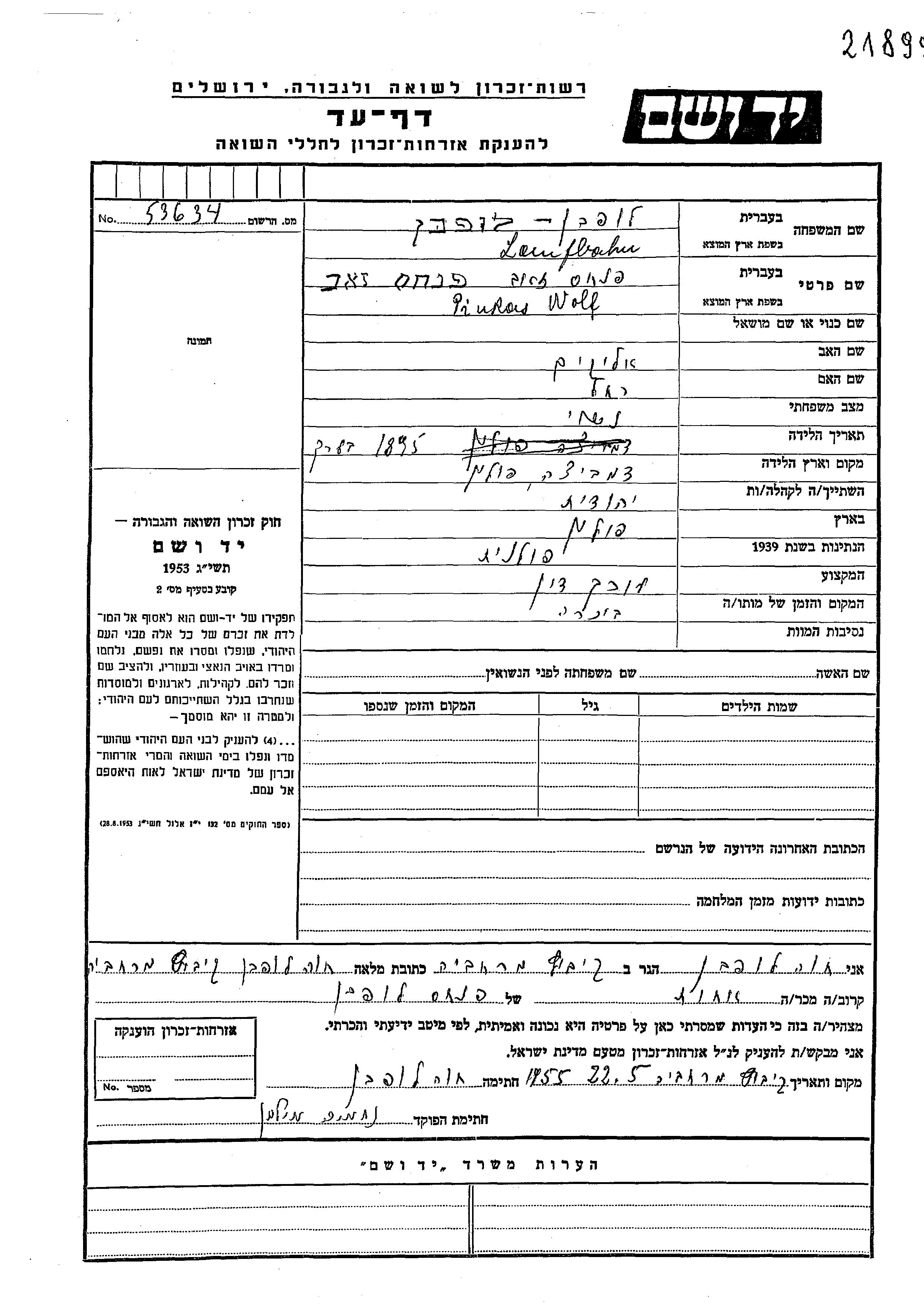 Лауфбан Пинхас Вольф Зеев 1895 Дембица, Польша Лист свидетельских показаний