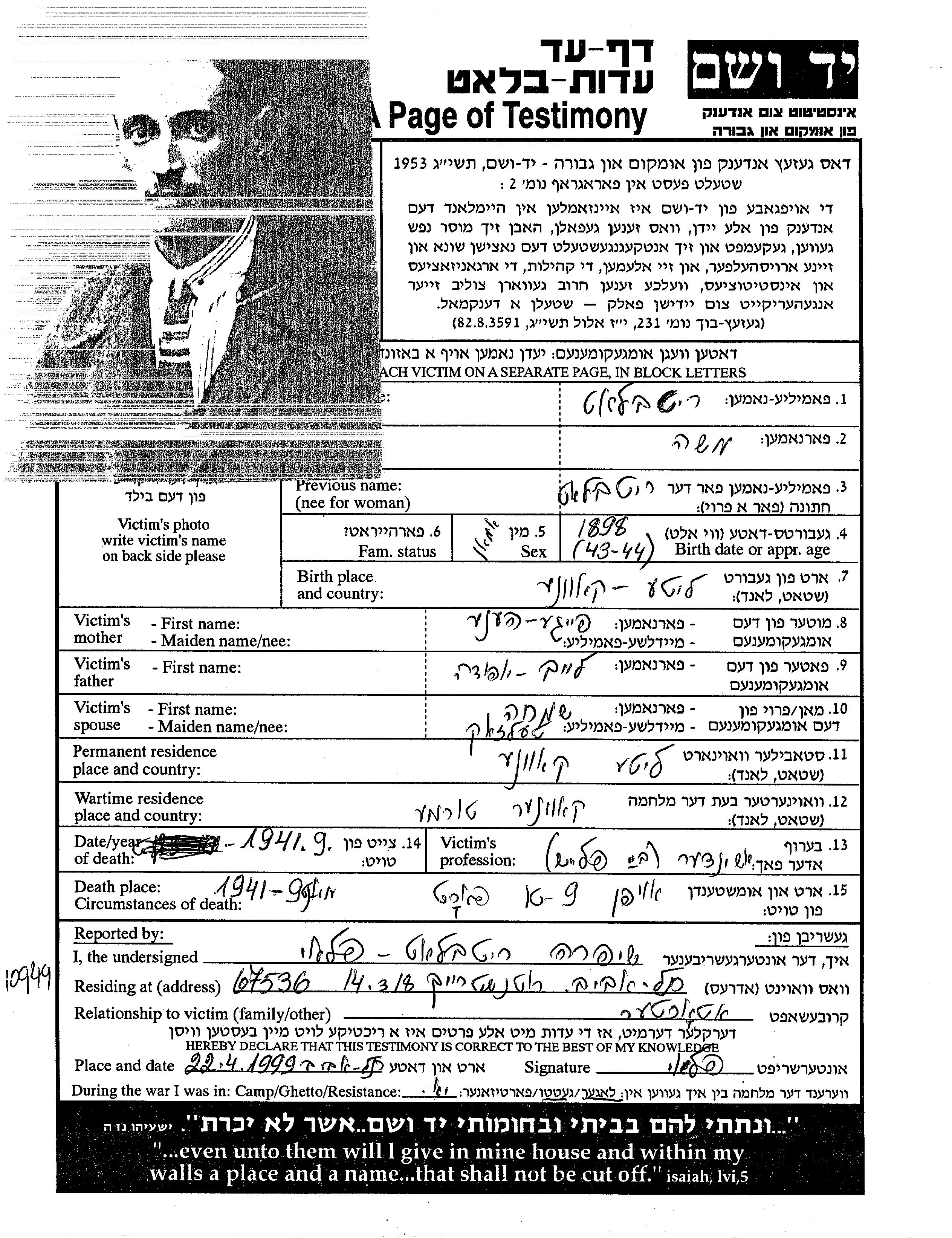 Яд Вашем - Листы свидетельских показаний Мемориального фонда