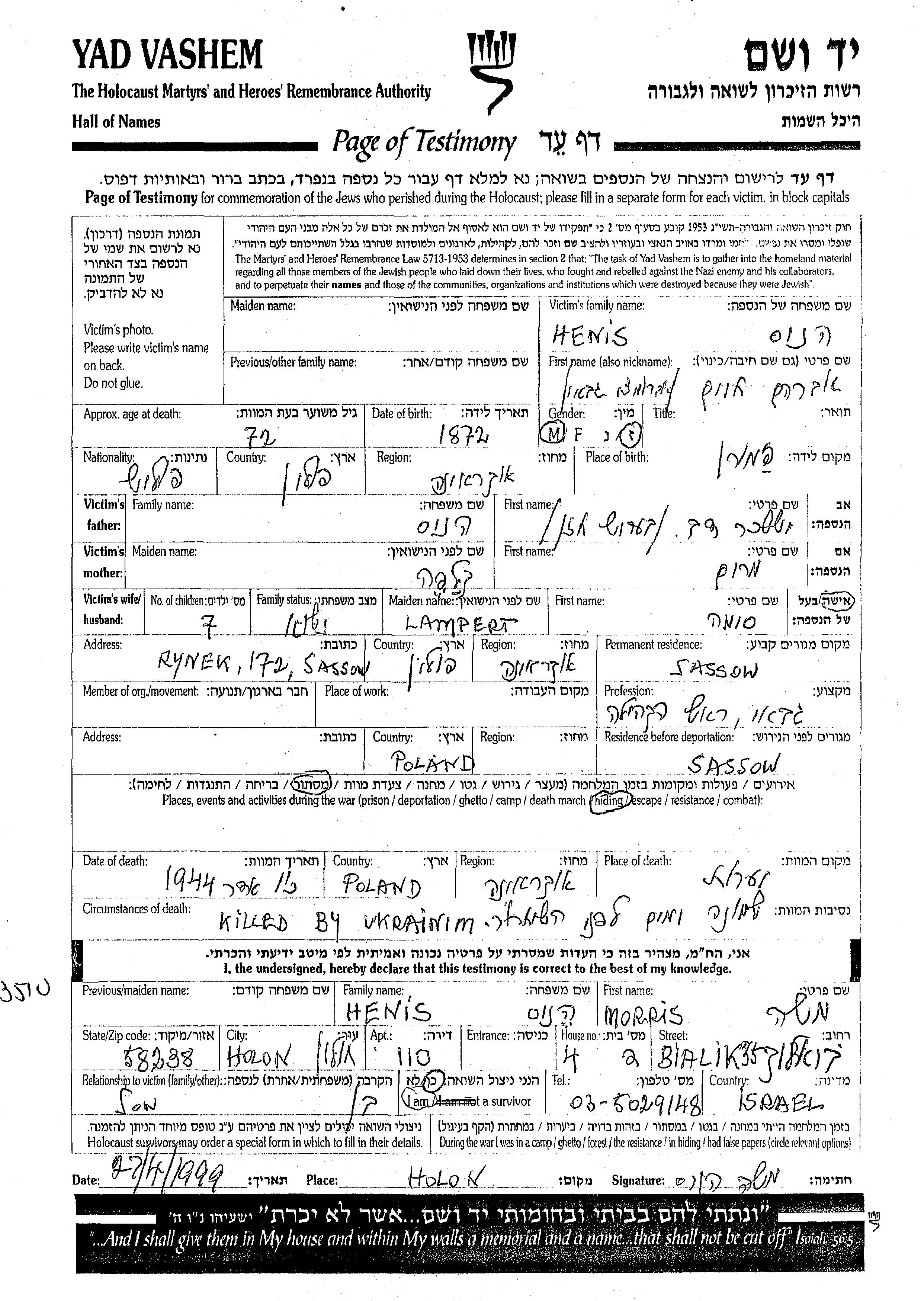 Хенис Авраам Хаим 1872 Сасов, Польша Лист свидетельских показаний
