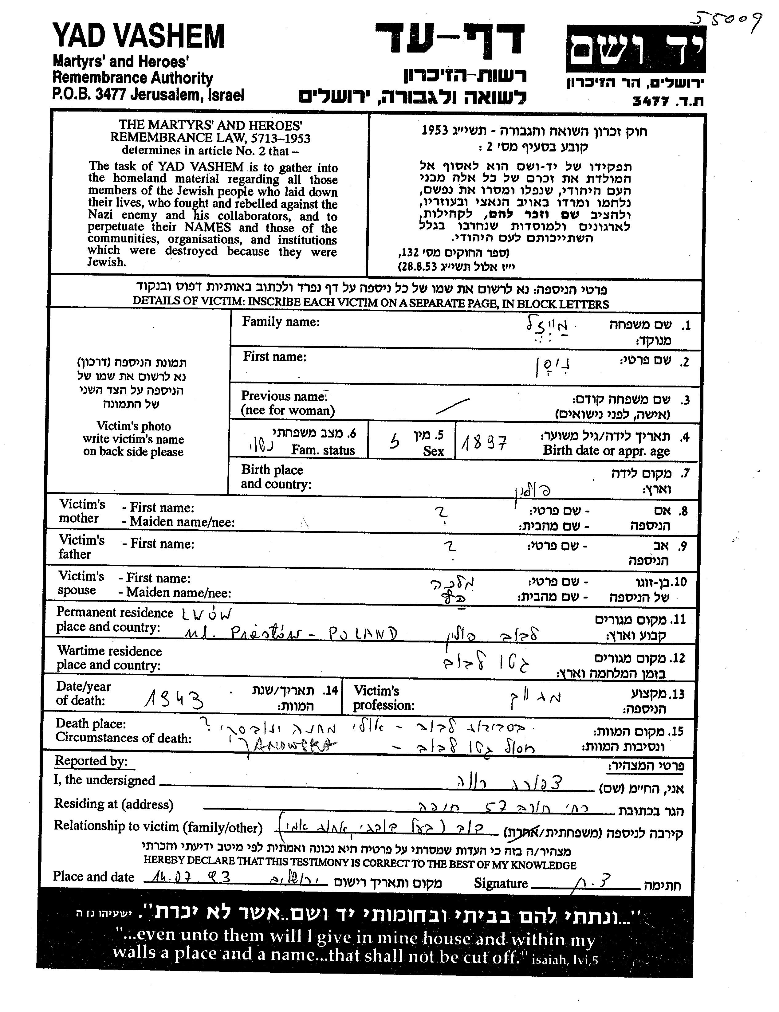 Яд Вашем - Листы свидетельских показаний Мемориального фонда
