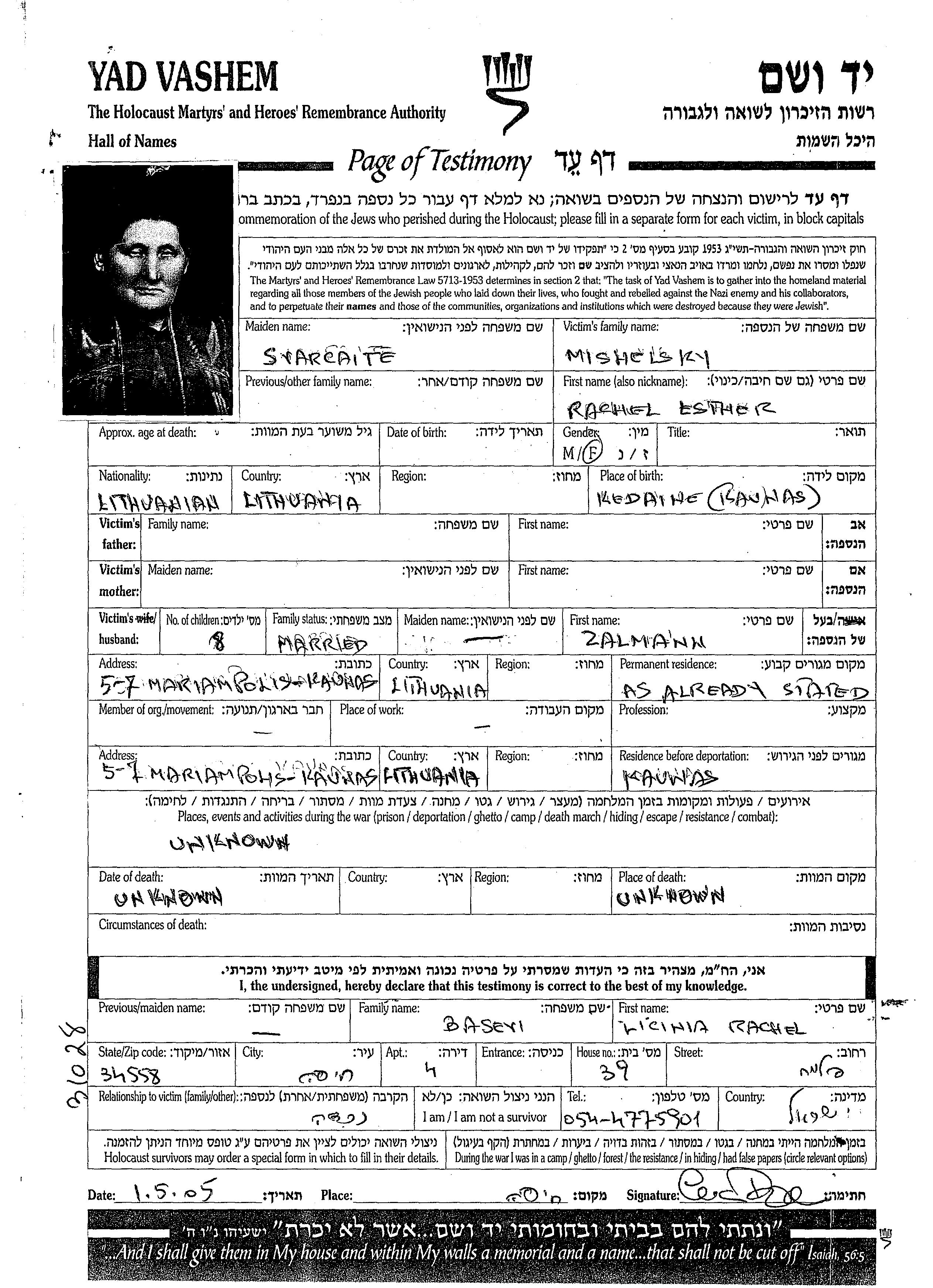 Мишельски Эстер Рахель Каунас, Литва Лист свидетельских показаний