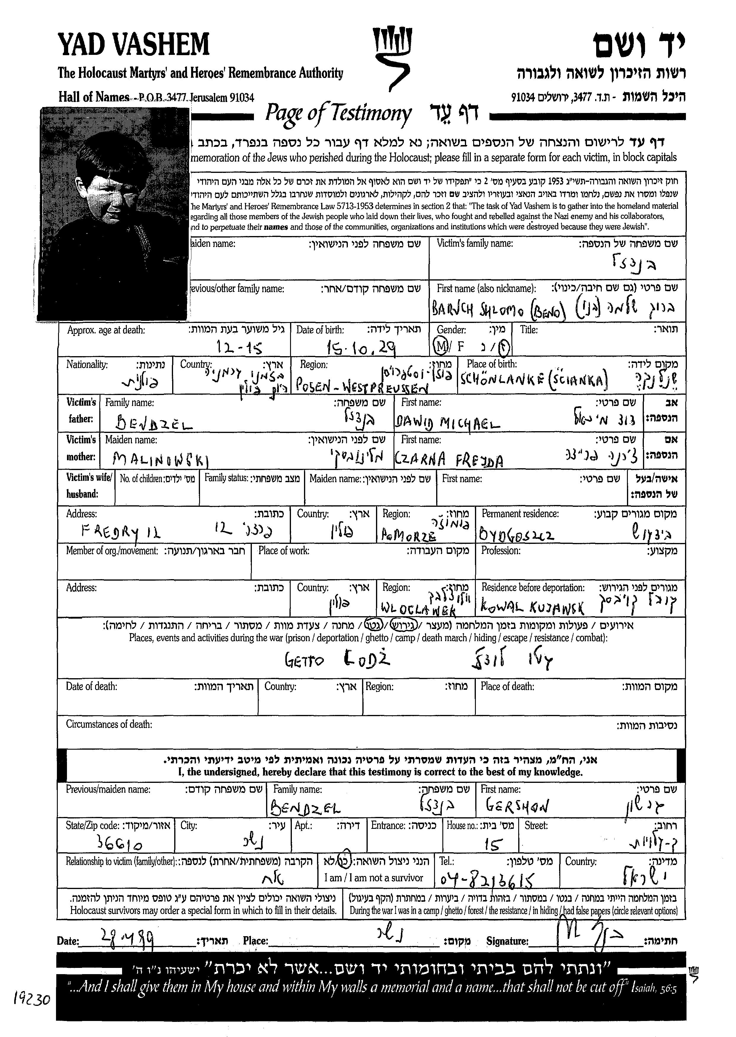 Барух Бено Шломо Бензель, место рождения: Шёнланке, Германия. Место жительства до войны: Быдгощ, Польша.