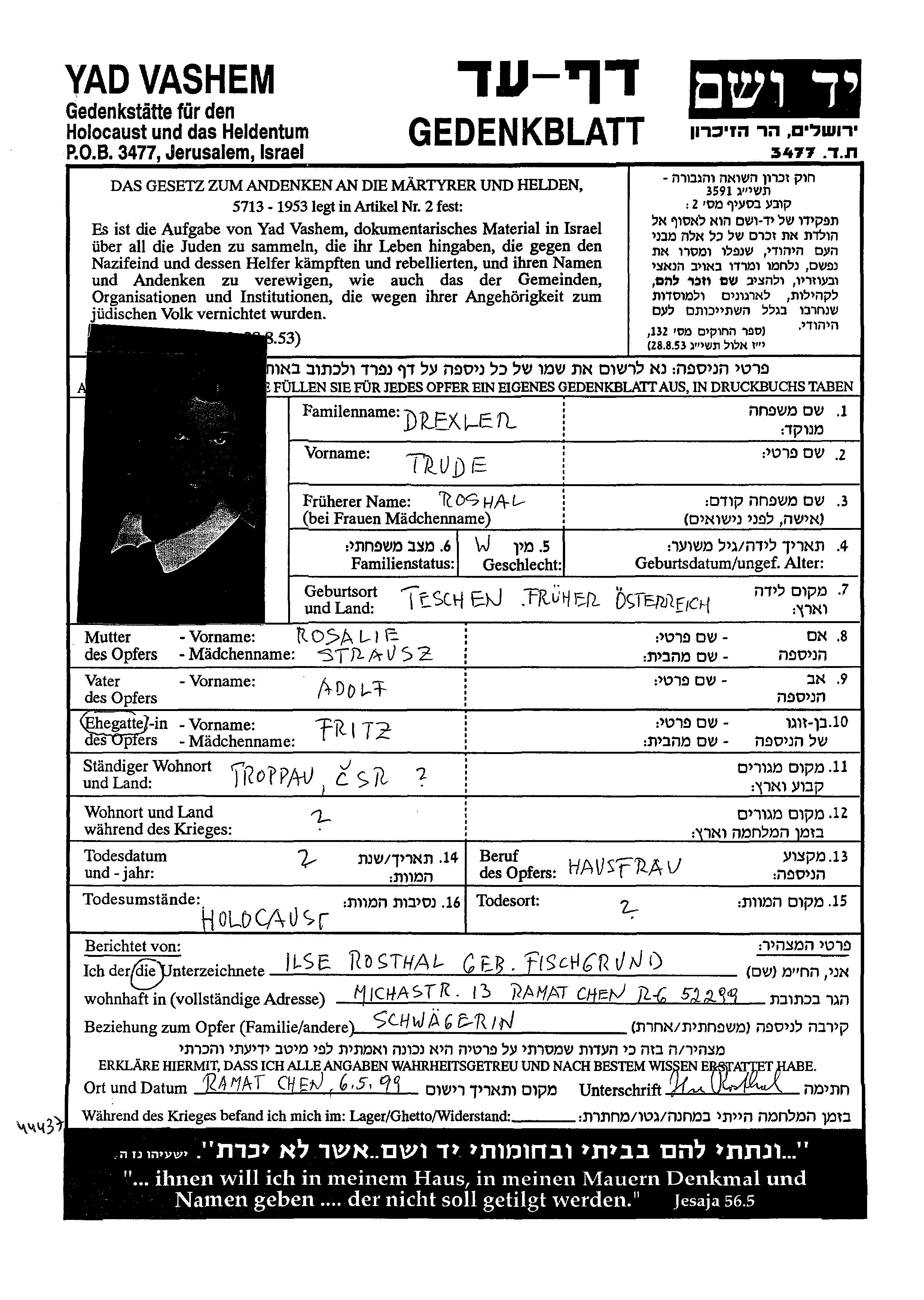 Труде Дрекслер, девичья фамилия Росталь, место рождения: Чески Тешин, Чехословакия. Домохозяйка. Место жительства до войны: Опава, Чехословакия.