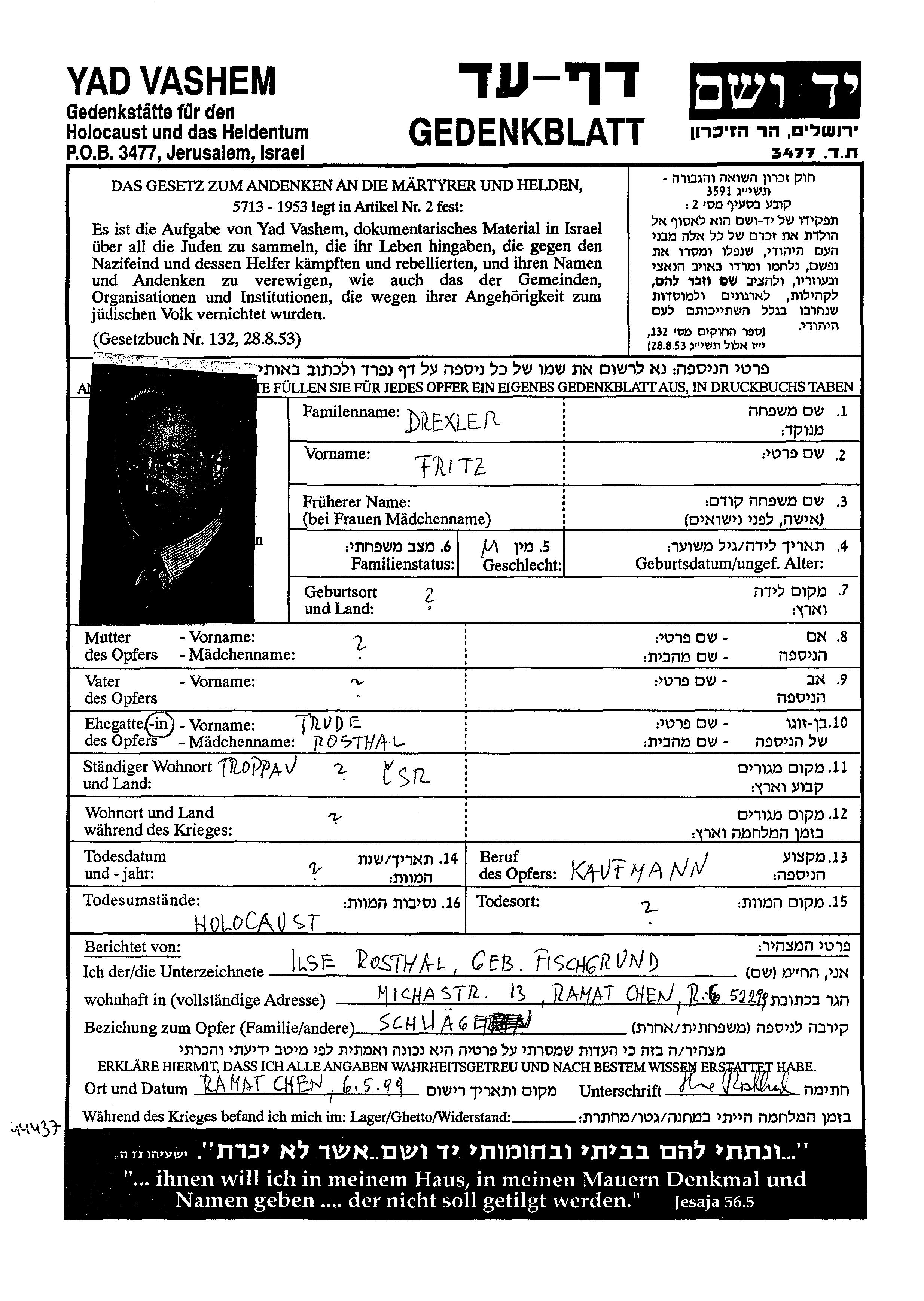 Фриц уничтожен в период Шоа. место смерти: место не указано.