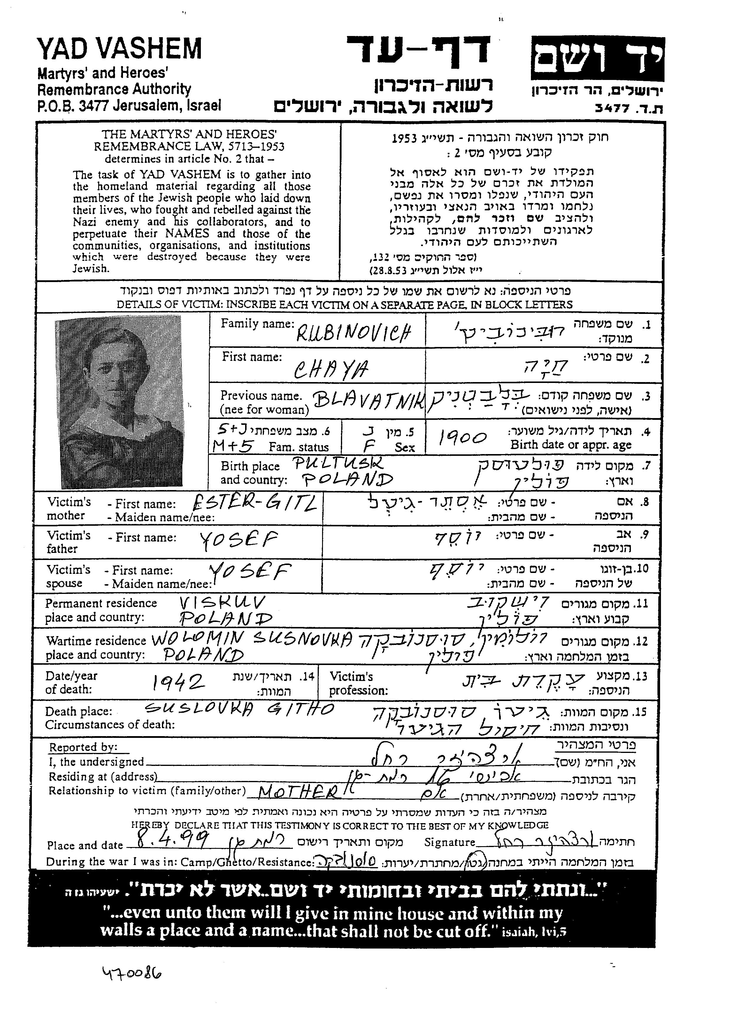 Хая Рубинович, девичья фамилия Блаватник, место рождения: Пултуск, Польша. Домохозяйка. Место жительства до войны: Вышков, Польша.